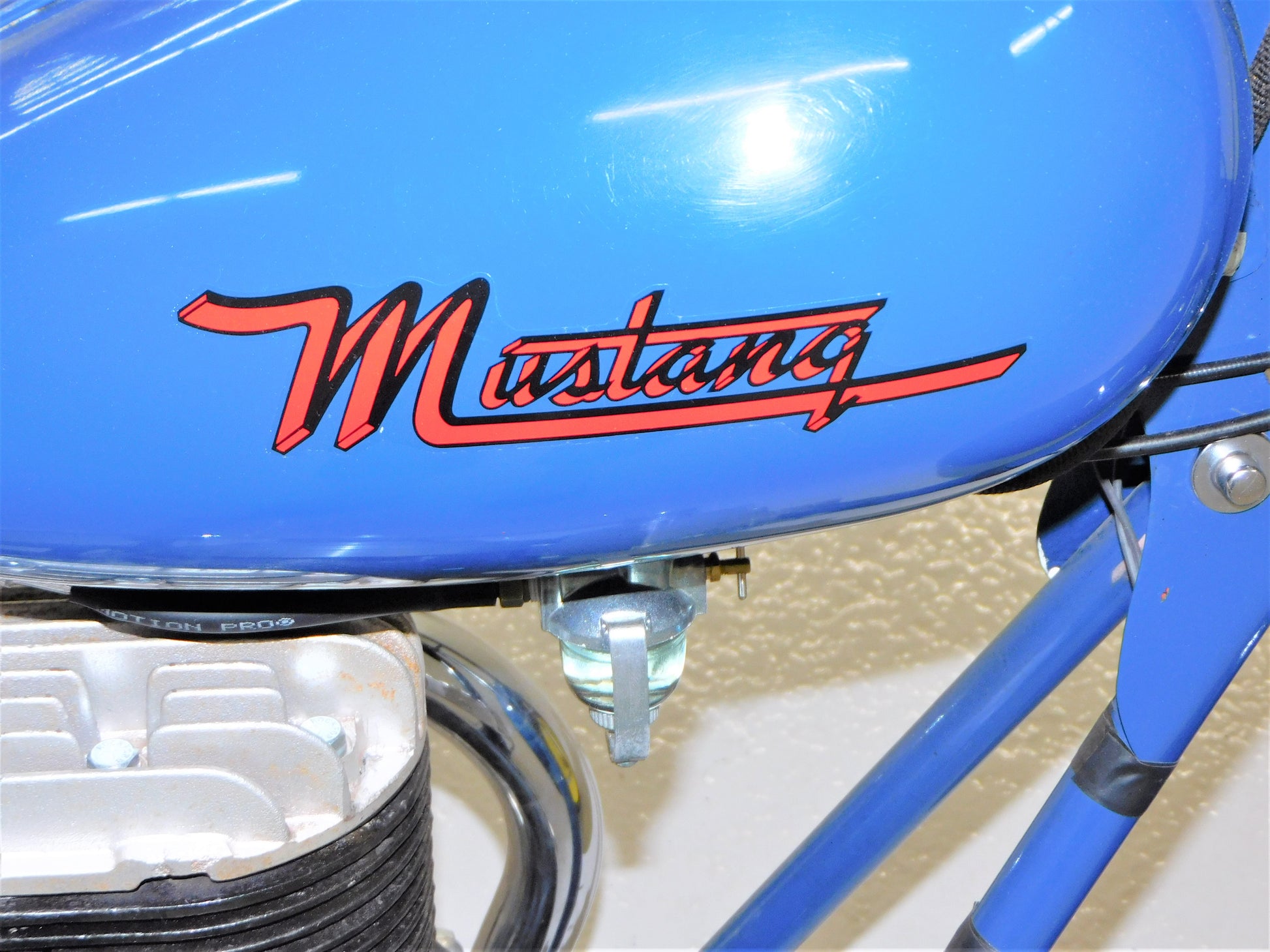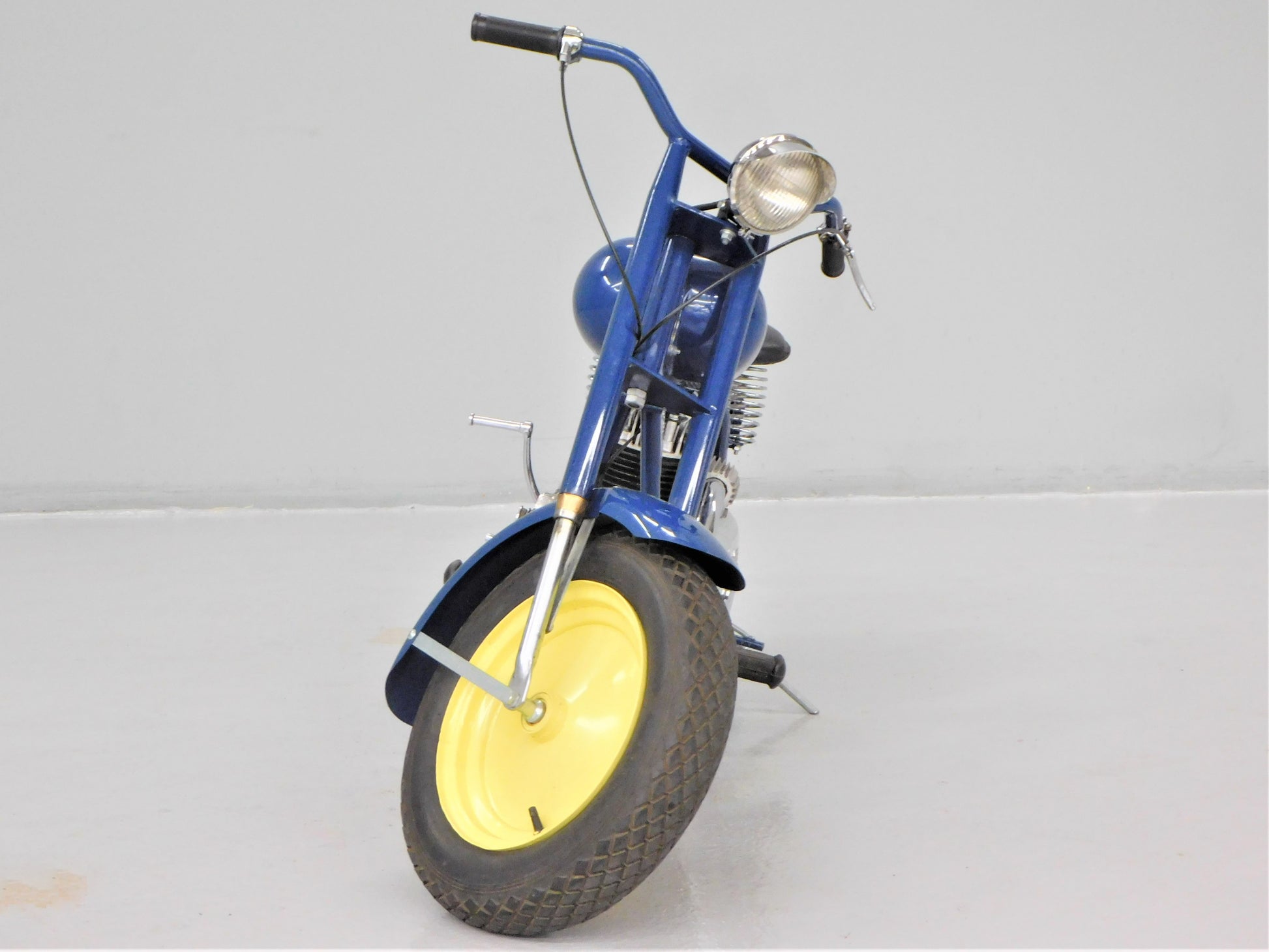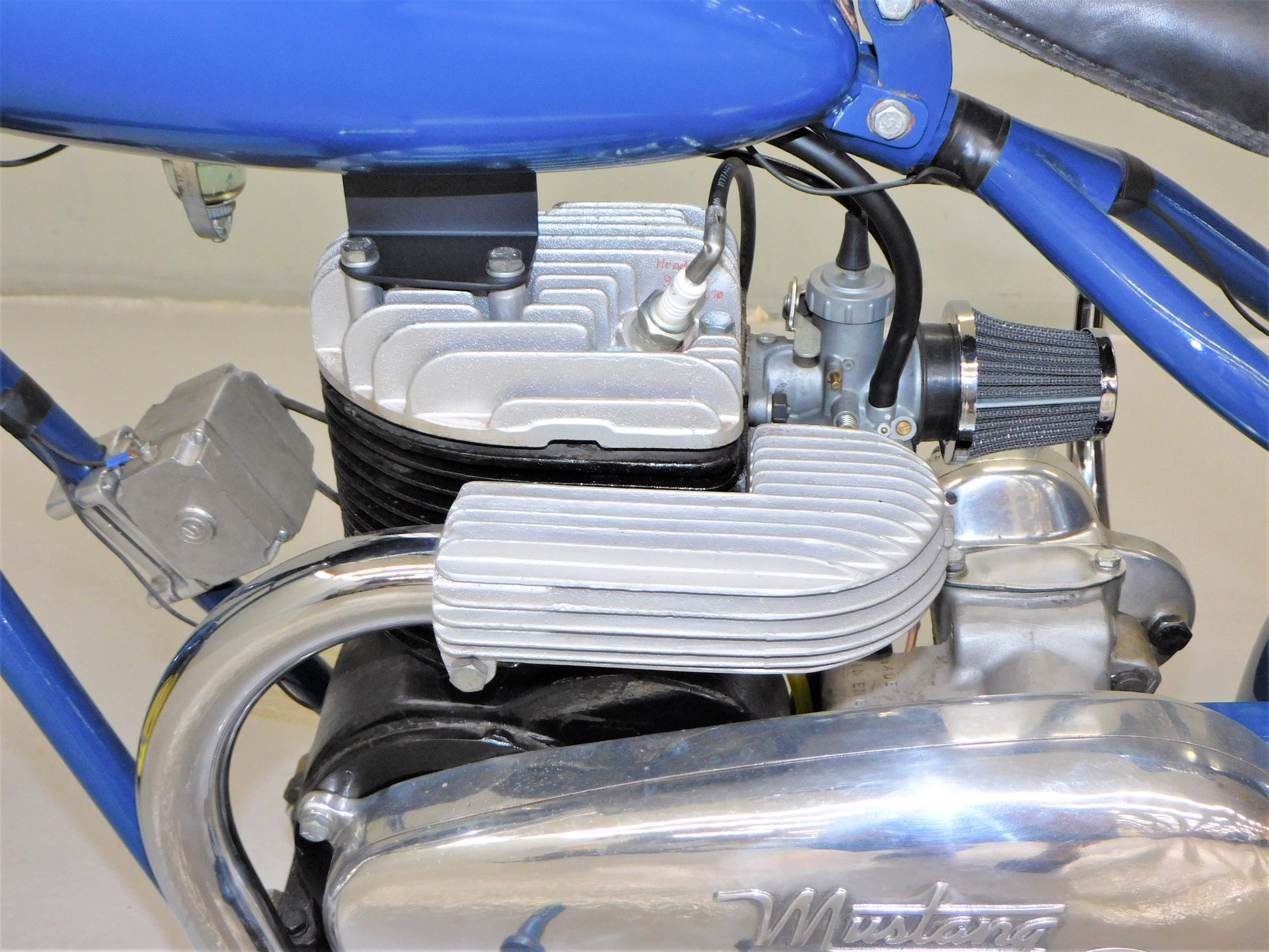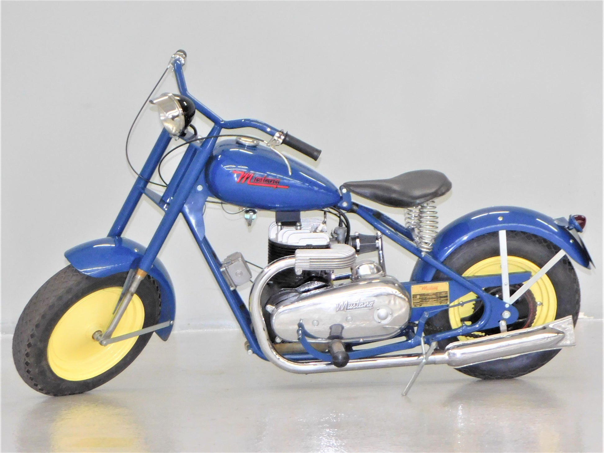 The Mustang was a lightweight motorcycle built by Gladden Products Corporation in Glendale, California from 1946-1965 as a transition between a scooter and a full-sized motorcycle. British Villers engines were hard to come by after the war, so Gladden purchased the Busy Bee Company, a manufacturer of small engines. In 1947, they introduced the Mustang Model 2 utilizing the new Busy Bee 320cc side-valve single cylinder engine and a 3-speed Burman transmission (made in England). This 1947 Mustang Model 2 has been fully restored and runs well. The consignor does not have a title for this scooter, but we will get it titled for you. ALL ITEMS SOLD "AS-IS".