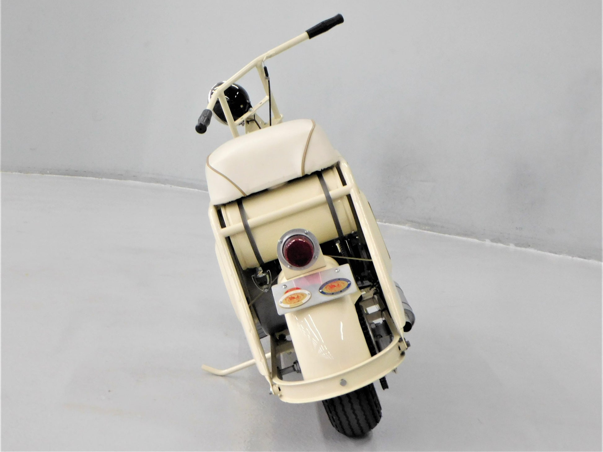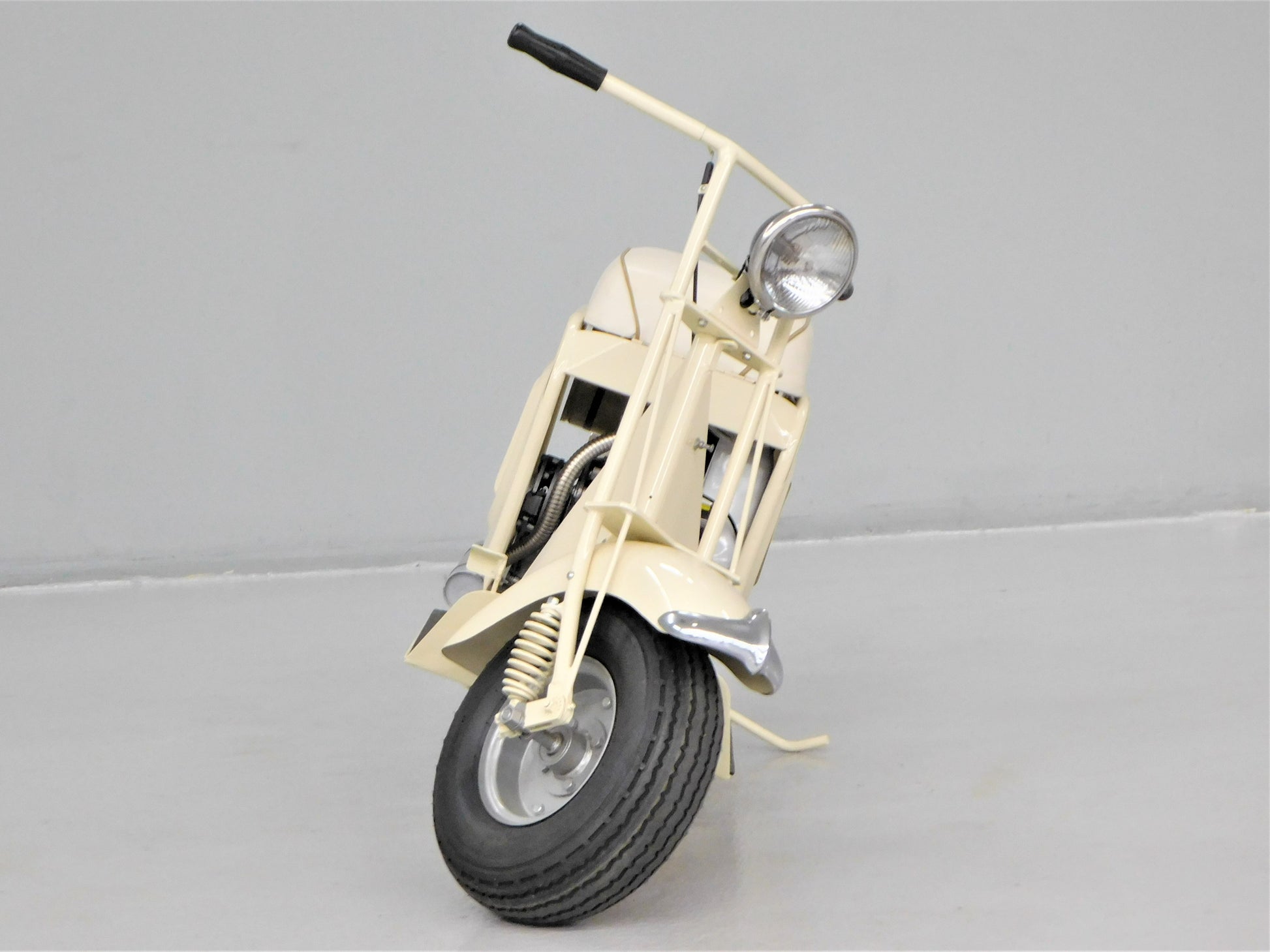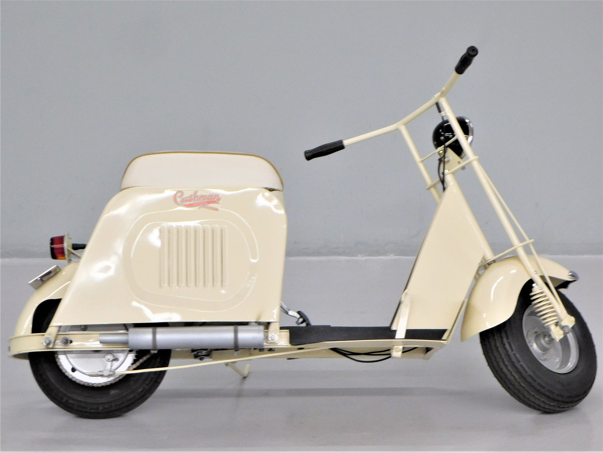 Discover the classic beauty of a fully restored 1952 Cushman Deluxe Highlander. Lovingly and meticulously brought back to its original condition by Sonny Sain, master watch repair man, this piece features remarkable detail and uncompromising quality in starlight white. A timeless classic, you won't find a finer example elsewhere. This is a running scooter. The consignor does not have a title for this scooter, but we will get it titled for you. ALL VEHICLES SOLD "AS-IS".