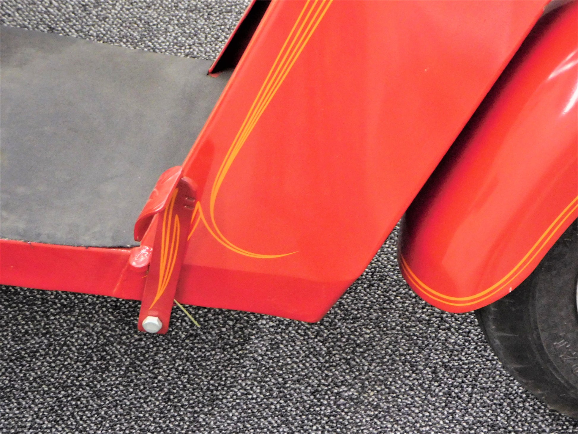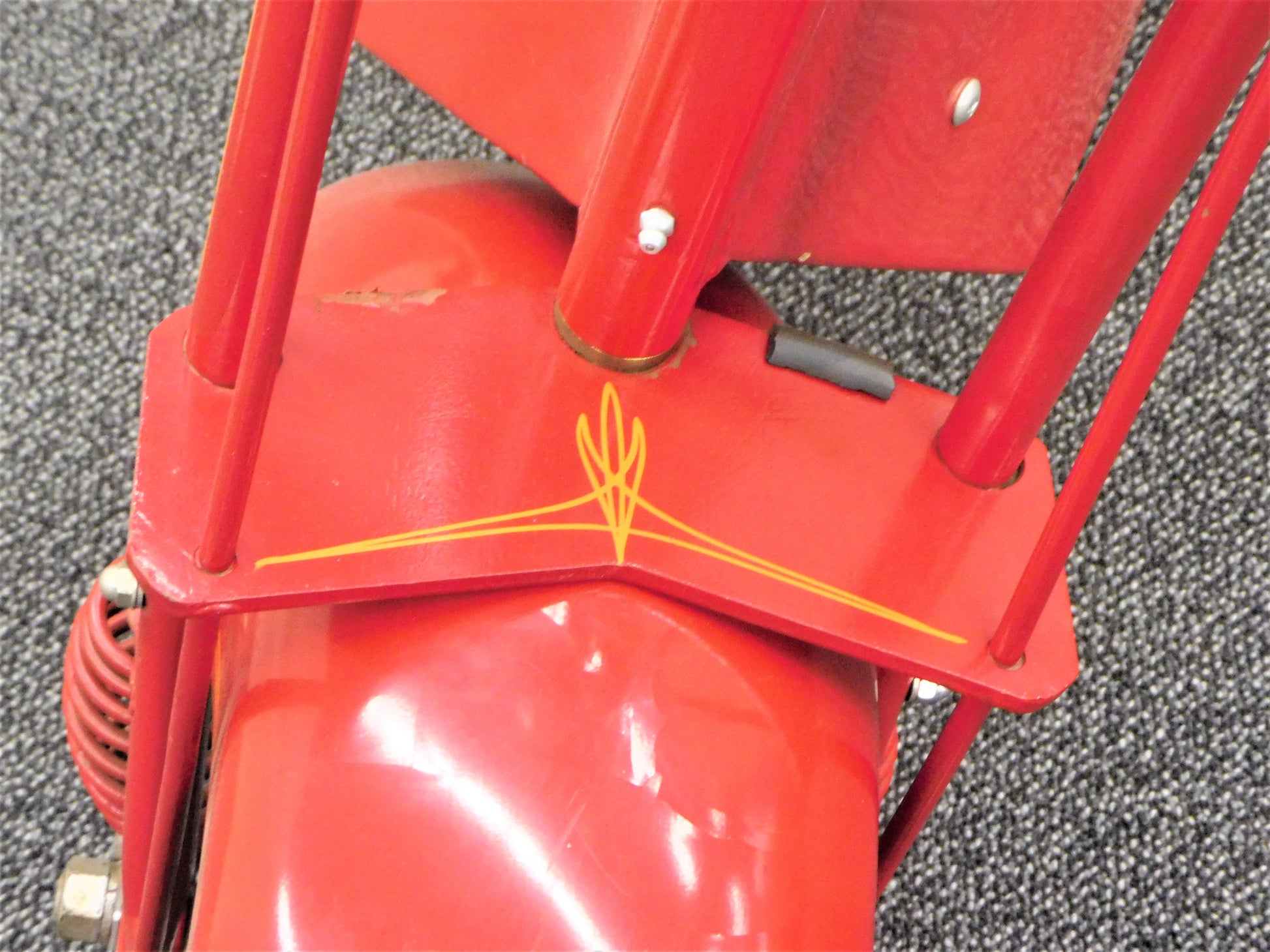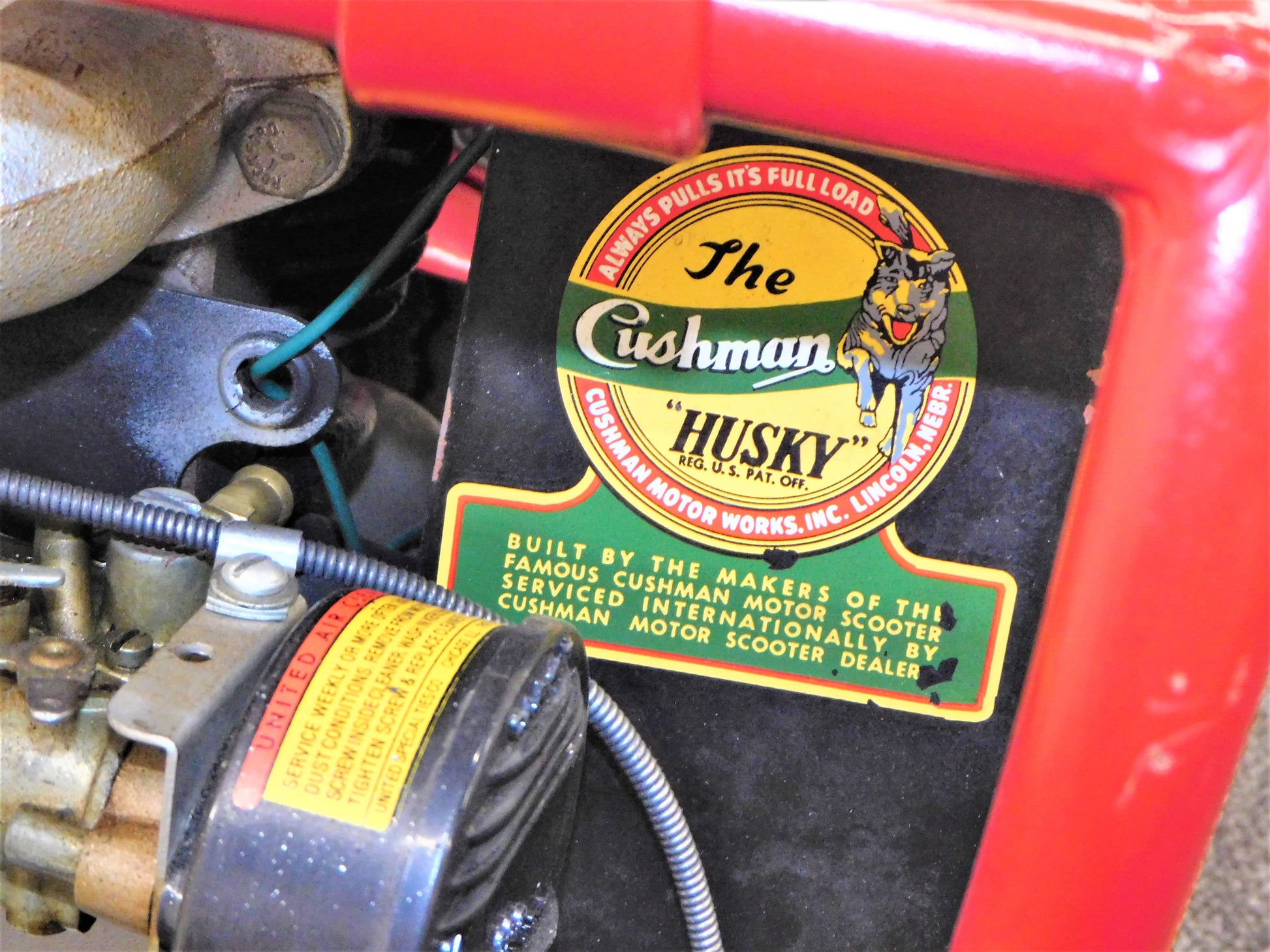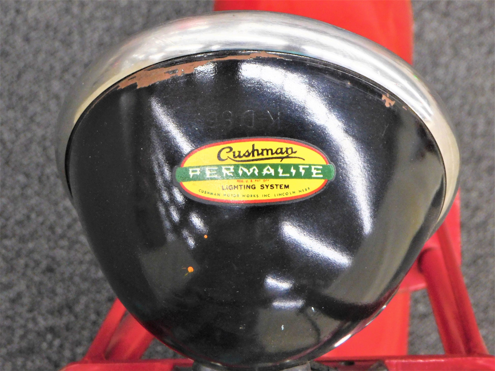 This sunfast red 1956 Cushman Highlander was owned by the late Peggy McClure. Ms. McClure was a very important long-term employee of The Cushman Motor Works. She began her employment there is 1952 and retired in 1986. She was very prominent in the early formation of the Cushman Club of America by providing advice and historical documents from the Cushman Motor Works. The CCOA even named an award after her. The "Peggy McClure Award" was created in 2002 after her 2001 death, and was awarded to the owner of the nicest Silver Eagle at the National Meet. This Cushman was very well cared for and is an older non-authentic restoration. It comes to us through the estate of the late Dennis Carpenter. This is a running scooter but it does not have a title. Since it is only 3 HP, it is classified as a Moped and can be registered but not titled in NC. Check with your local DMV for their requirements. ALL VEHICLES SOLD "AS-IS"