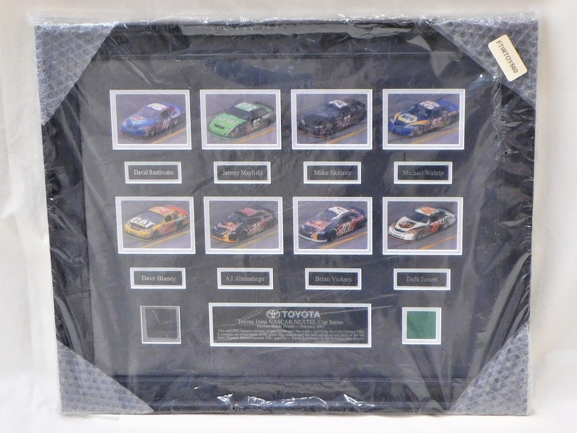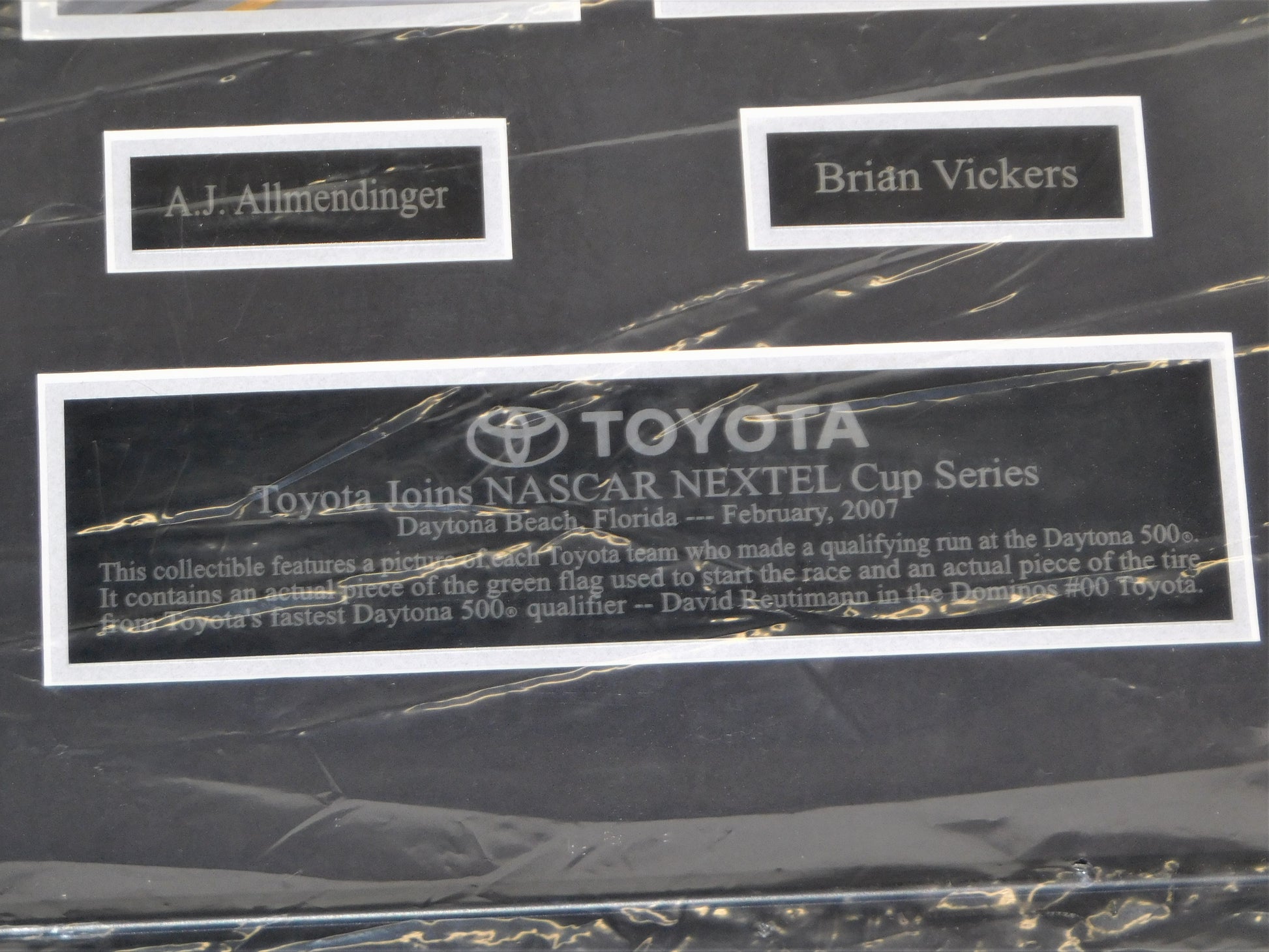 Score the ultimate memento for the NASCAR fan in your life: A plastic-wrapped 2007 Toyota Joins NASCAR Cup Series Commemorative Frame! With this commemorative frame, you get a piece of history—including a piece of the Green Flag at the 2007 Daytona 500 and a piece of the tire from Toyota's fastest qualifier! Put the pedal to the metal and get yours now! Frame measures 24.5"x20.5"x1". ALL ITEMS SOLD "AS-IS"