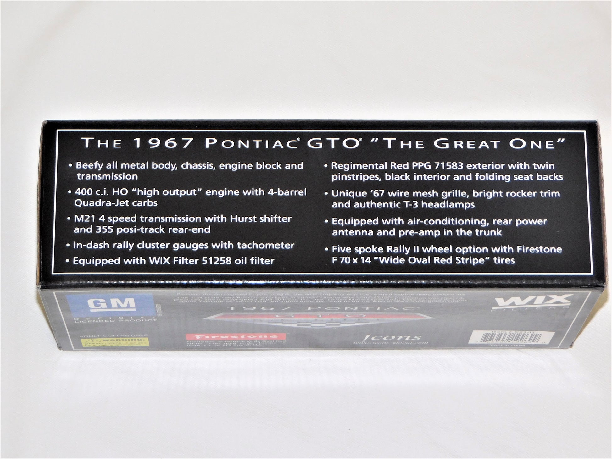 WIX Filters started their collectible promotions (offered at a special price with the purchase of two WIX filters) in 1991 and offered a different die cast vehicle every year until 2013. In 2008, the promotion was the 1967 Pontiac GTO. The 1967 GTO hardtop replica features a regimental red exterior, black interior and white pin stripes with five spoke Rally II sport wheels and Firestone wide oval red stripe tires. The detail on the collectible is perfect, including the unique 67 wire mesh grille, bright rocker trim, authentic T-3 headlamps, and rare front seat headrests.