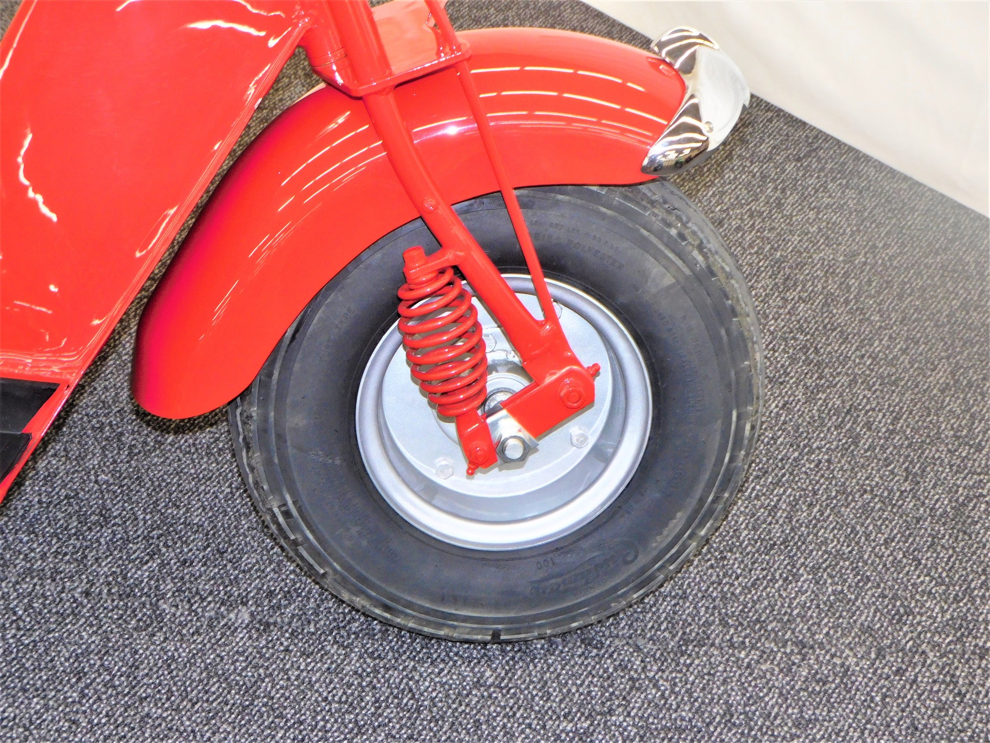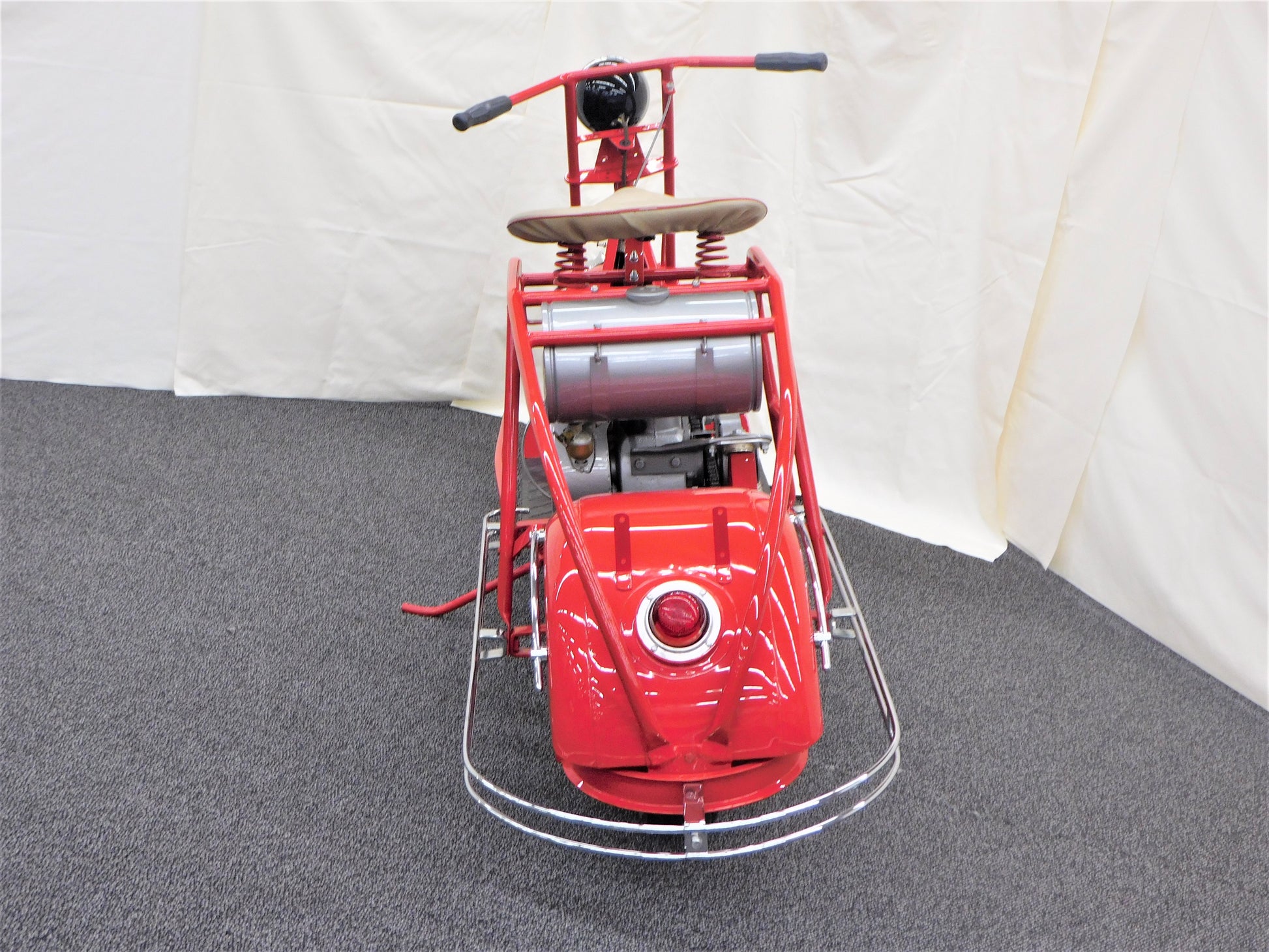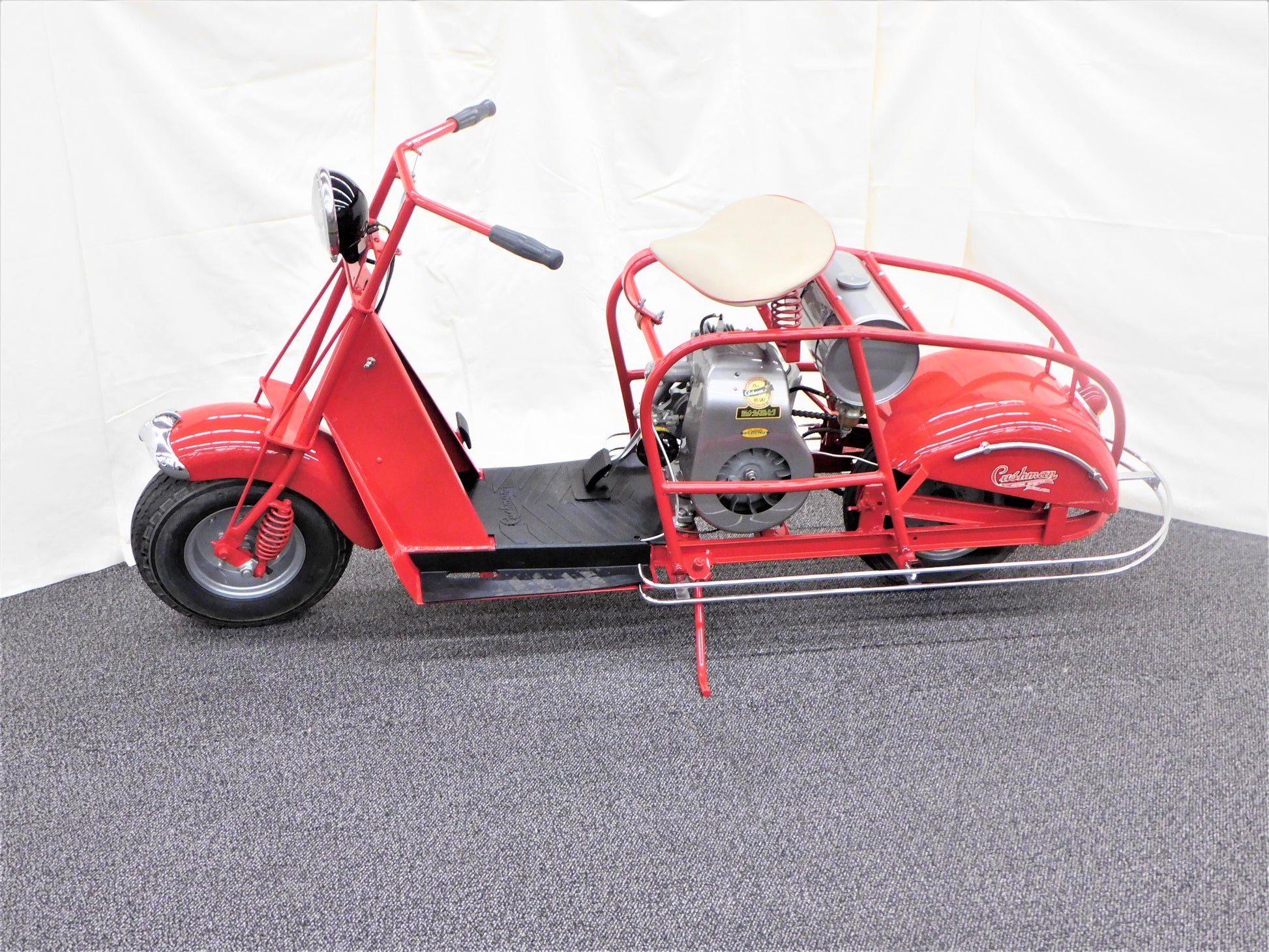 The Model 62 used a 4.8 HP version of Cushman’s Husky 221cc single-cylinder side valve motor, paired with a single-speed drive and centrifugal clutch, which made it very easy to use. This Sunfast Red 1949 Pacemaker had an original authentic style restoration - front fender tip, rail bumper, no floormat. It has an early type tubular seat frame mounted on it. The scooter comes to us from the estate of Dennis Carpenter and it was assembled by Charles Cox and painted by Bones Cooper. This is a running scooter. The consignor does not have a title for this scooter, but we will get it titled for you. ALL VEHICLES SOLD "AS-IS"
