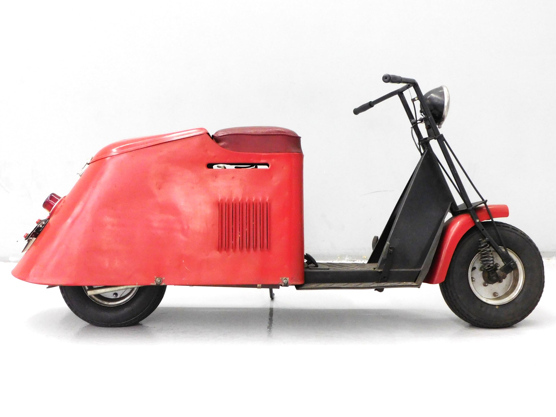 Rev up your collection with this 1952 Cushman Road King, featuring an older restoration in red and black. With 7.3 HP and a title, this bike is sure to be a prized possession. This is a running scooter. ALL ITEMS SOLD "AS-IS".