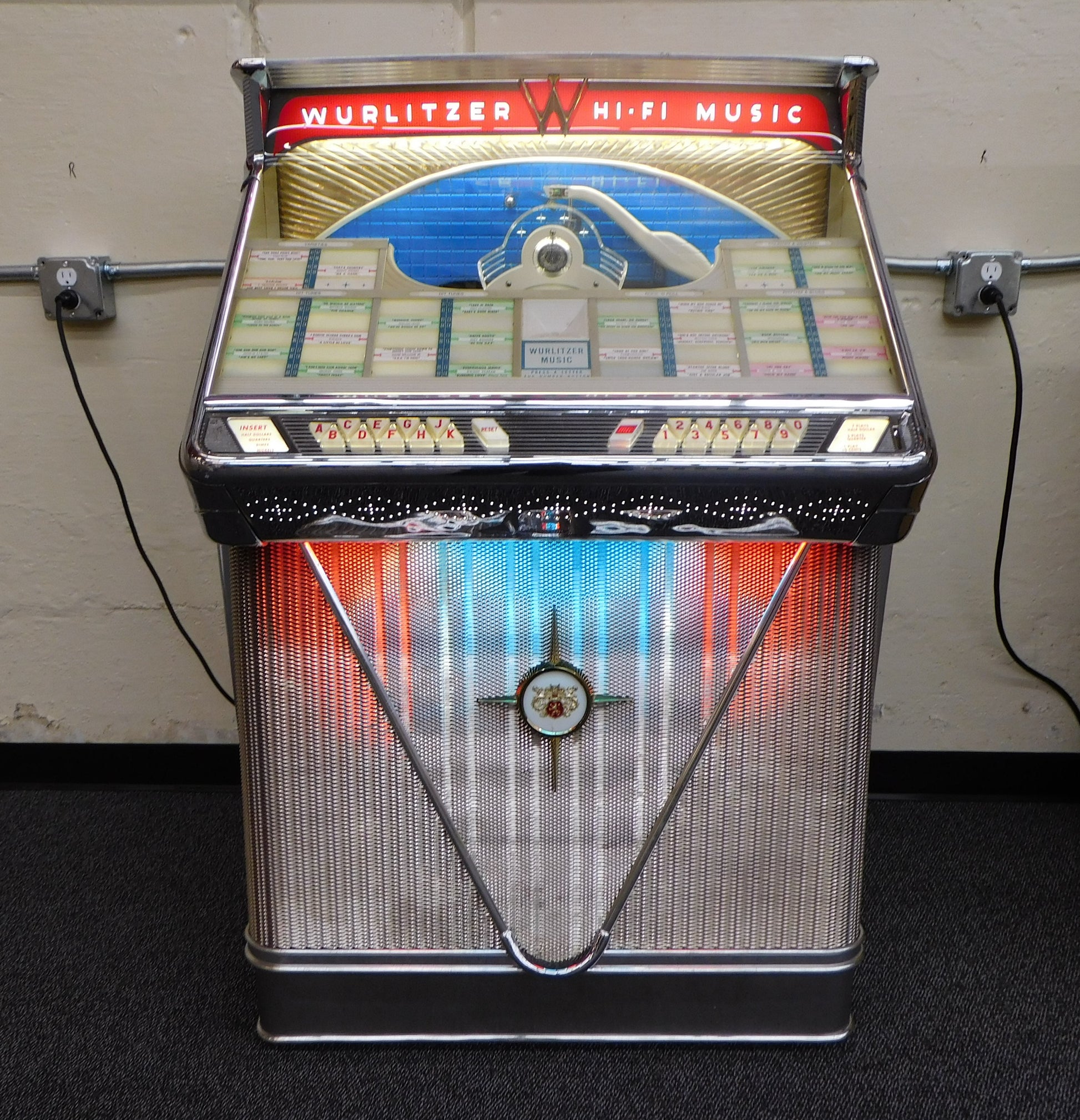 In the 1800s, Rudolph Wurlitzer attached a coin slot to a player piano and started the coin-operated music boom. In 1933, his son Farny Wurlitzer began manufacturing coin-operated phonographs and dominated until the introduction of the 45 rpm record. This original 1960 Wurlitzer Hi-Fi Music box comes to us from the collection of the late Dennis Carpenter. It has been completely restored and re-chromed. It is model 2410, plays 45s and can be set to either coin operated or free play. This jukebox comes with keys and the 45s that are in it. ALL ITEMS SOLD "AS-IS".