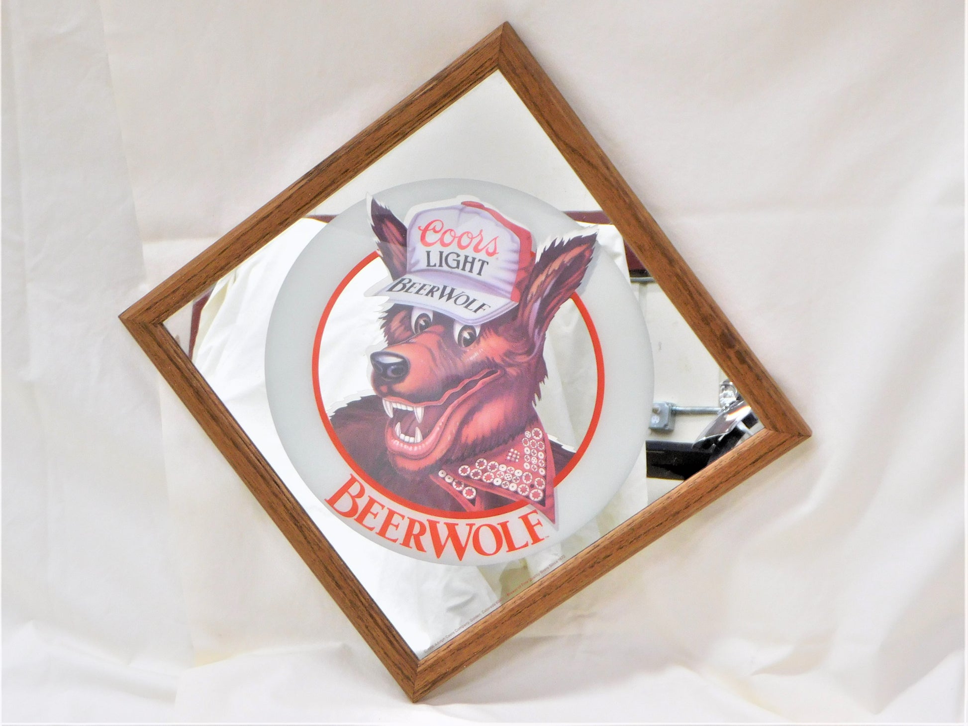 Enjoy a cold, crisp one in style with this vintage 1986 Coors Light BeerWolf Bar Mirror! Set in an oak frame with a classic BeerWolf logo, this 16”x16” piece of nostalgia will put some serious shine on any wall. Who knew Coors had such a cool mascot back in the day? Time to go wild! ALL ITEMS SOLD "AS-IS"