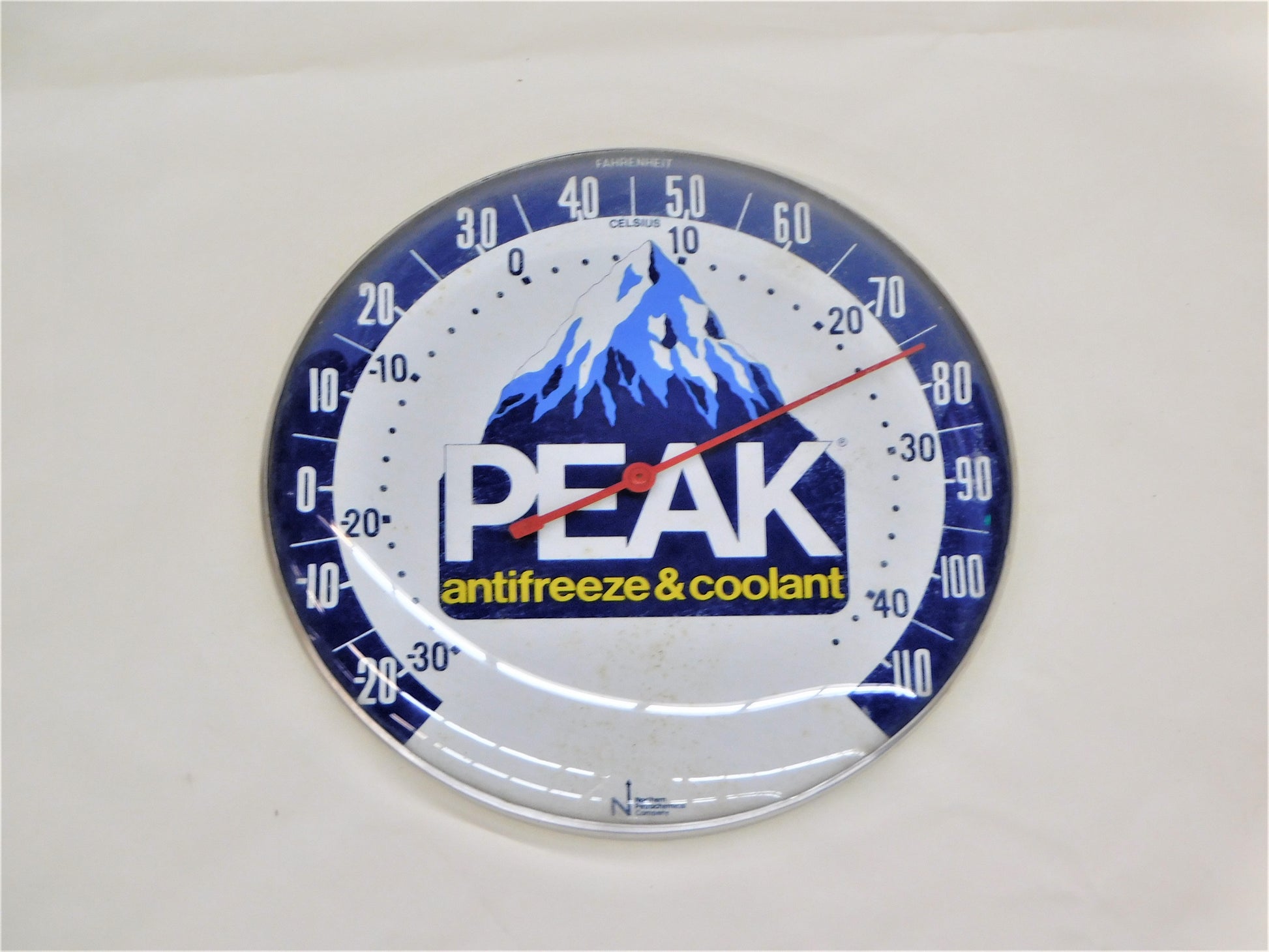 This Peak thermometer is original with a glass face. It is 10" diameter. ALL ITEMS SOLD "AS-IS"