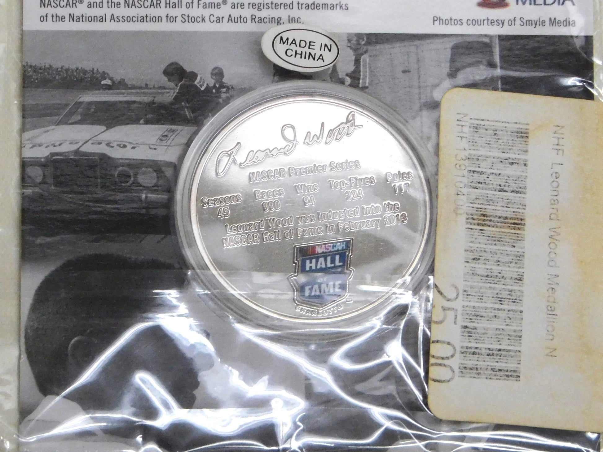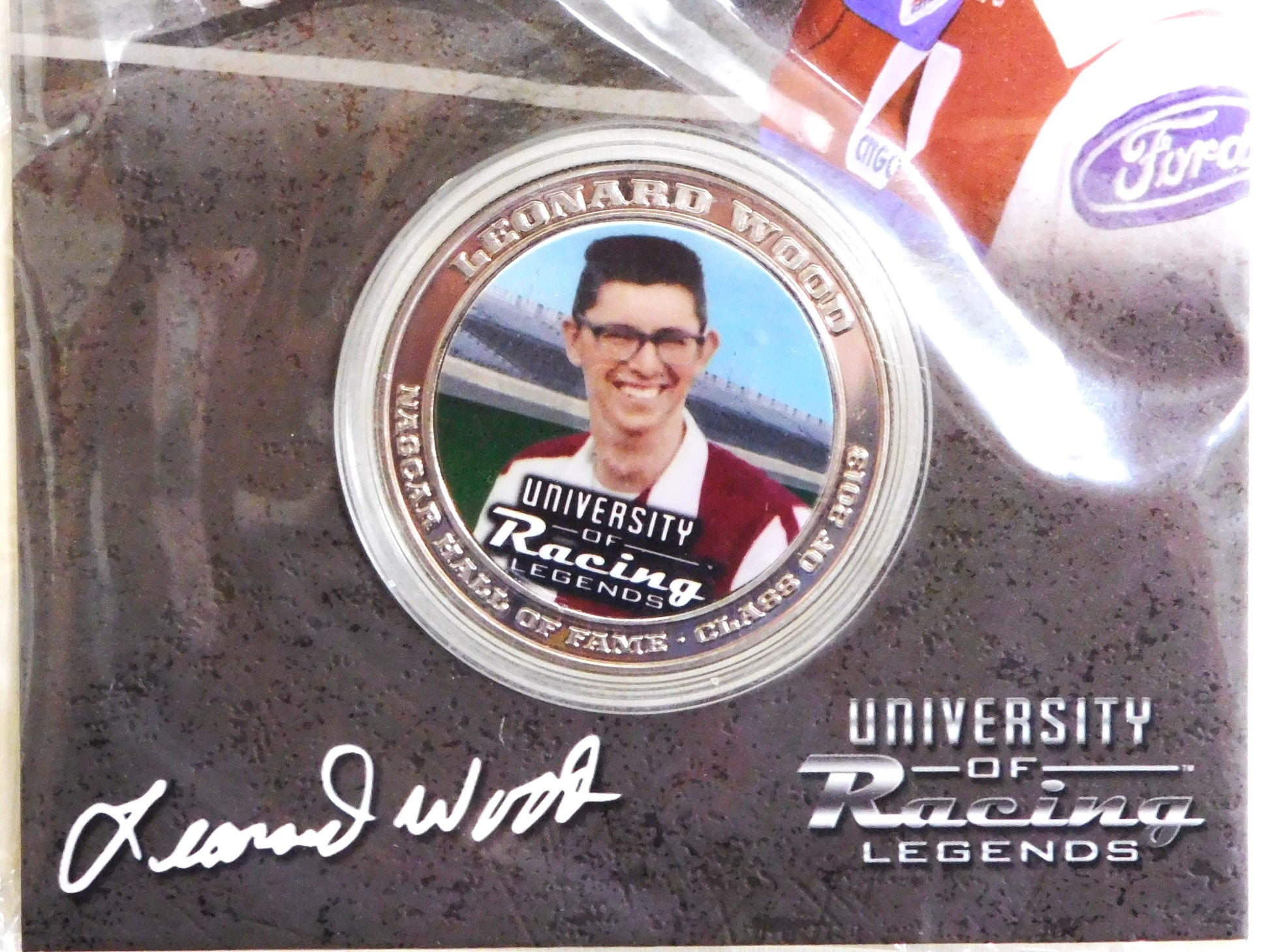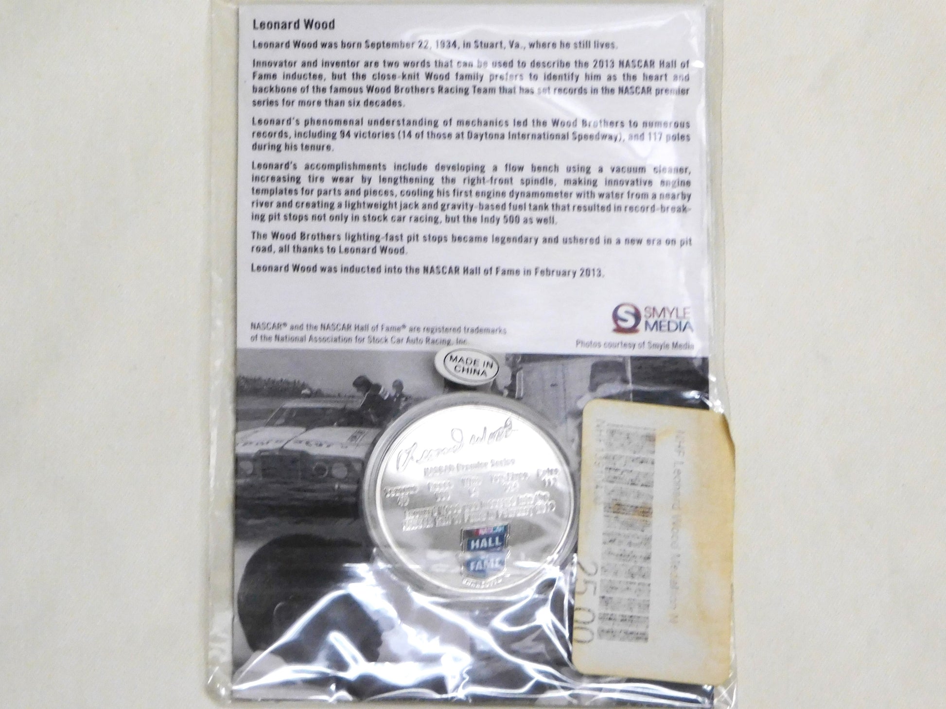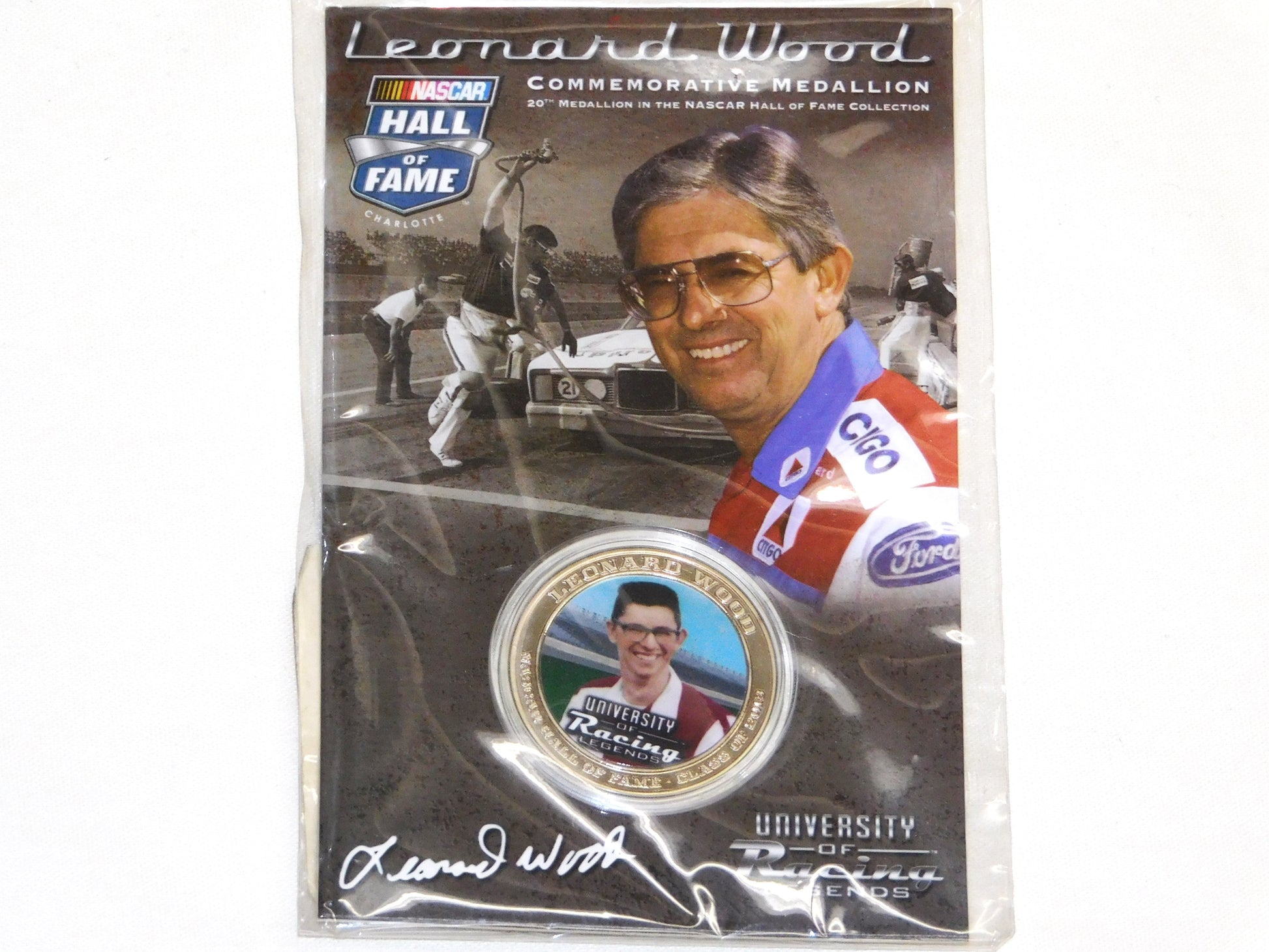 This is the 20th medallion in the NASCAR Hall of Fame Collection by the University of Racing Legends. The medallion features a color photo of Leonard Wood, and the back of the medallion has his racing stats from behind the scenes as a part of the Wood Brothers Racing Team. The package provides his history in racing. Leonard Wood was inducted into the NASCAR Hall of Fame in February 2013. The medallion comes in the original, unopened package. ALL ITEMS SOLD "AS-IS"