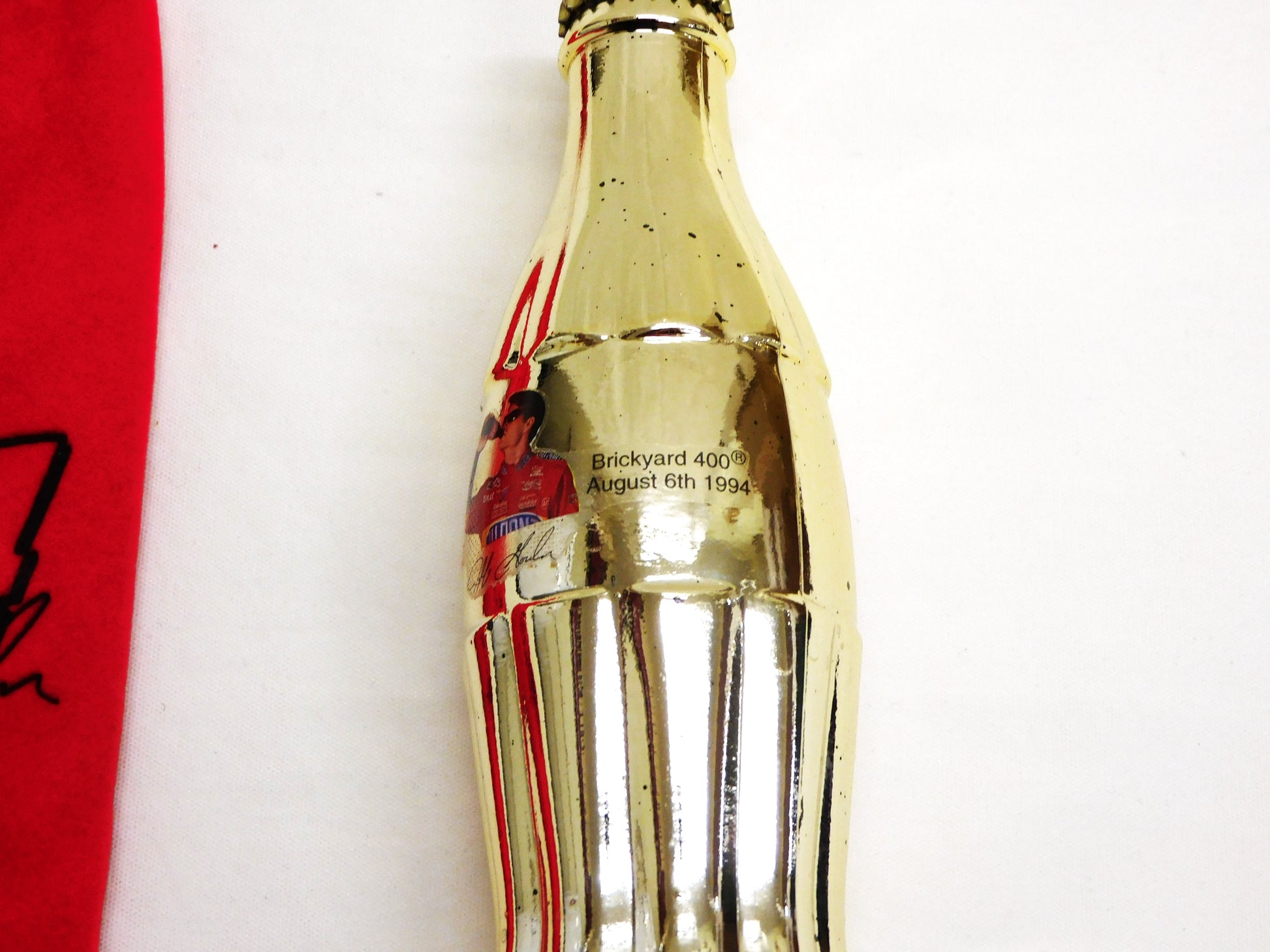 Grab a piece of racing history with this 1994 Gold Jeff Gordon Coca-Cola Bottle. Commemorating Gordon's inaugural win at the Brickyard 400 on August 6, 1994, this 8.8 oz bottle is 1 of only 400 made. Don't miss out on a chance to own this collector's item! The bottle comes in a red velvet pouch. ALL ITEMS SOLD "AS-IS"