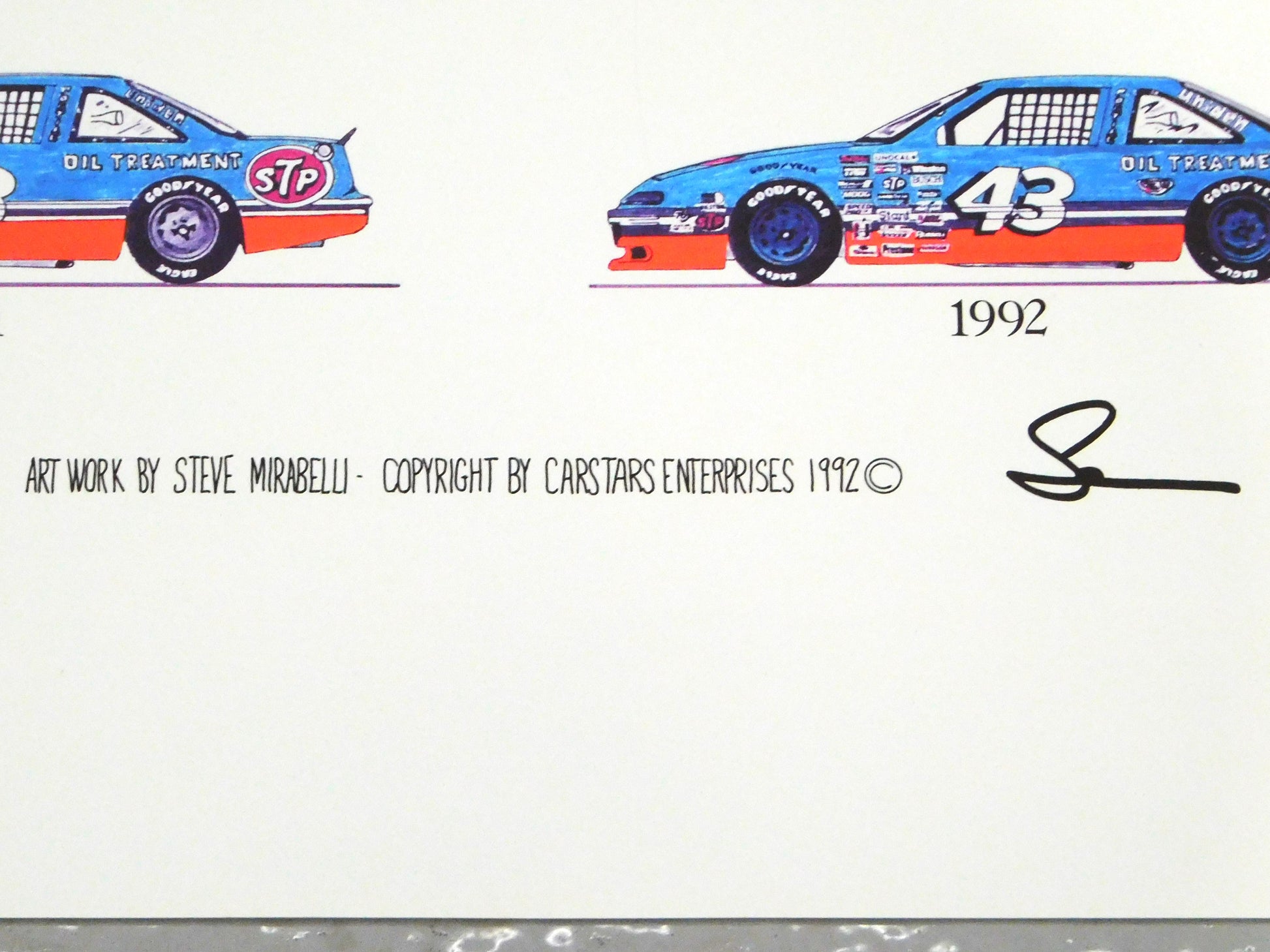 Artwork by Steve Mirabelli is hard to find. This poster is 20"x28" and shows the cars of Richard Petty from 1958-1992. Posters are brand new with no flaws. ALL ITEMS SOLD "AS-IS".