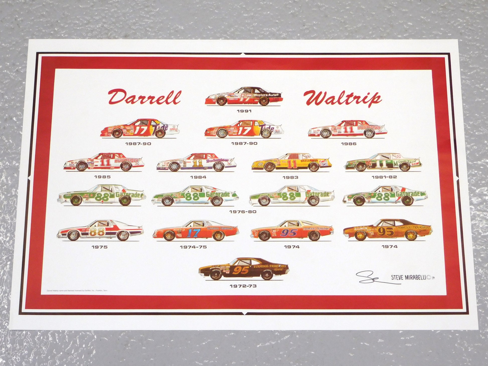 Artwork by Steve Mirabelli is hard to find. This poster is 28"x20" and shows the cars of Darrell Waltrip from 1972-1991. Posters are brand new with no flaws. ALL ITEMS SOLD "AS-IS".