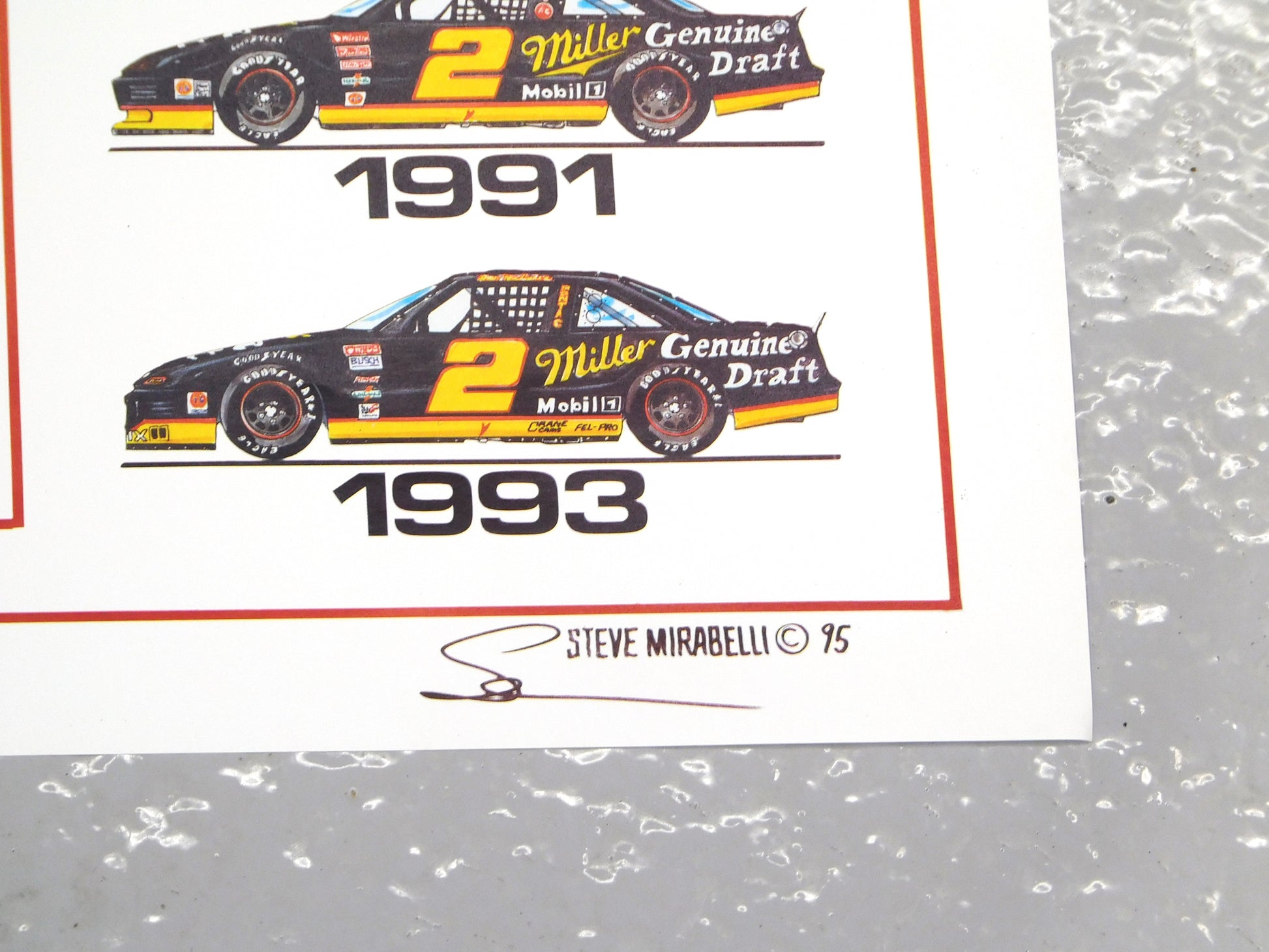 Artwork by Steve Mirabelli is hard to find. This poster is 28"x20" and shows Rusty Wallace, his cars from 1980-1993, and his autograph. We have 5 posters numbered 1802-1806 of 3000. Posters are brand new with no flaws. ALL ITEMS SOLD "AS-IS".