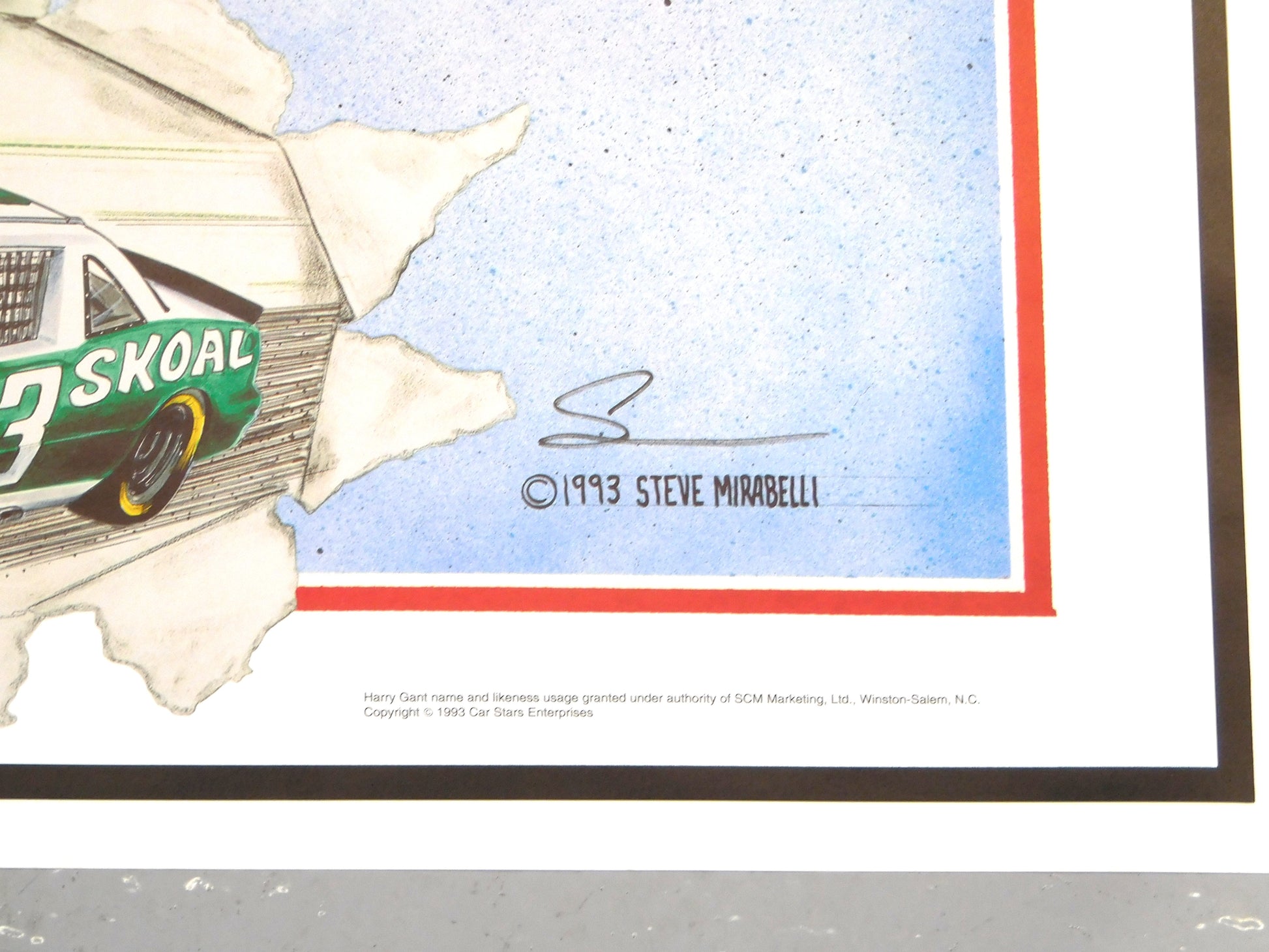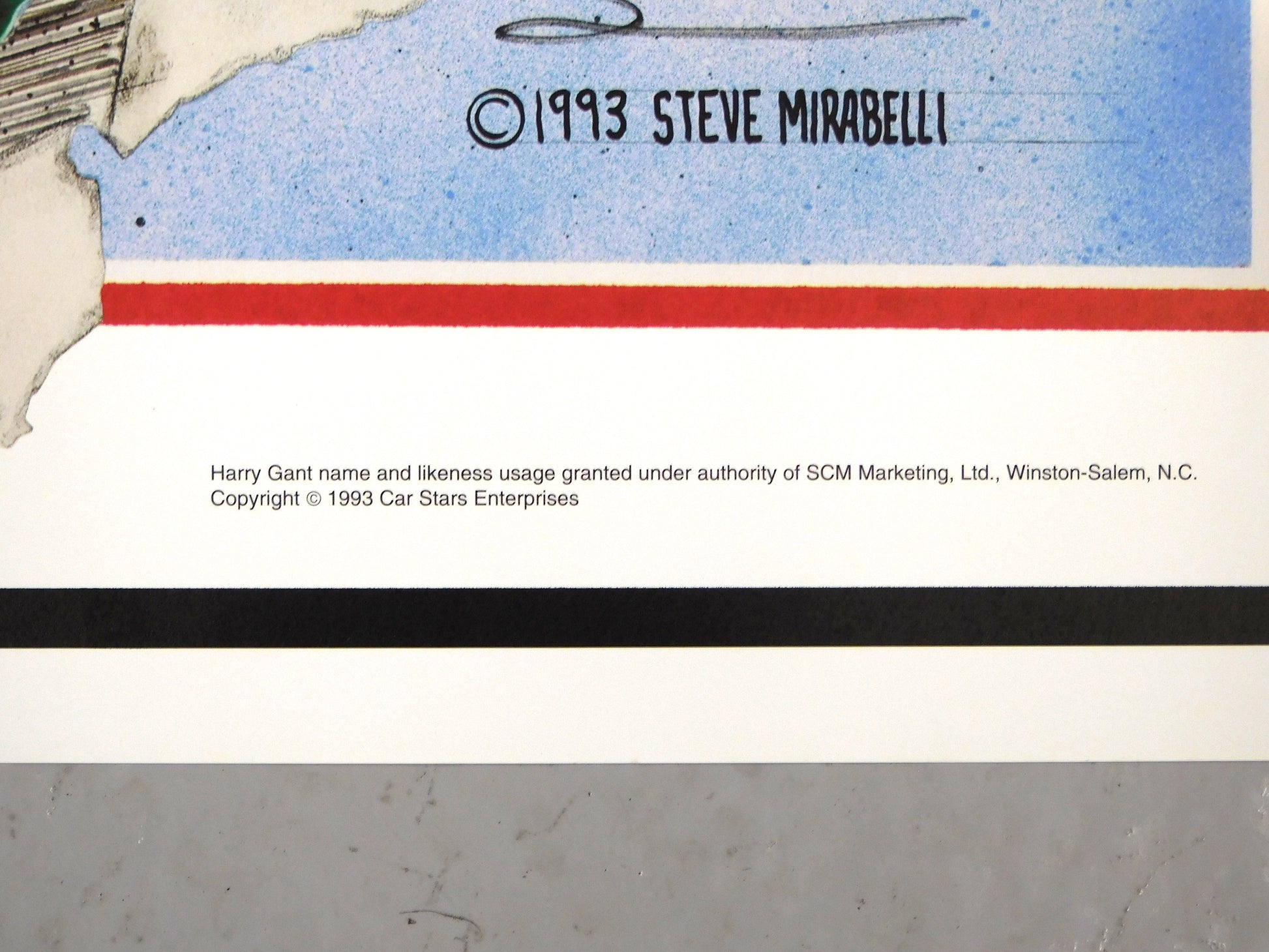 Artwork by Steve Mirabelli is hard to find. This poster is 28"x20" and shows Harry Gant, his cars from 1981-1993, and his autograph. Posters are brand new with no flaws. ALL ITEMS SOLD "AS-IS".