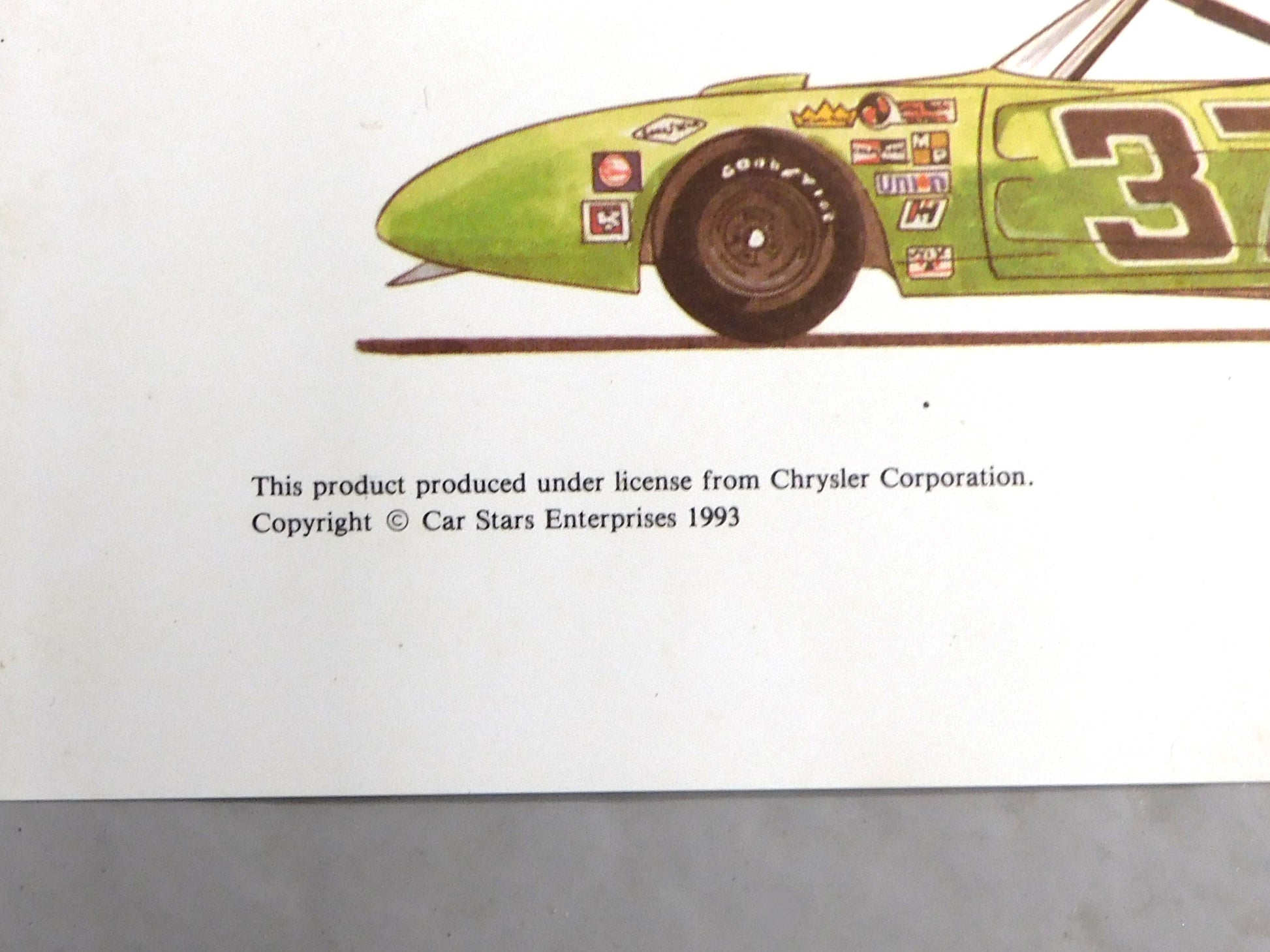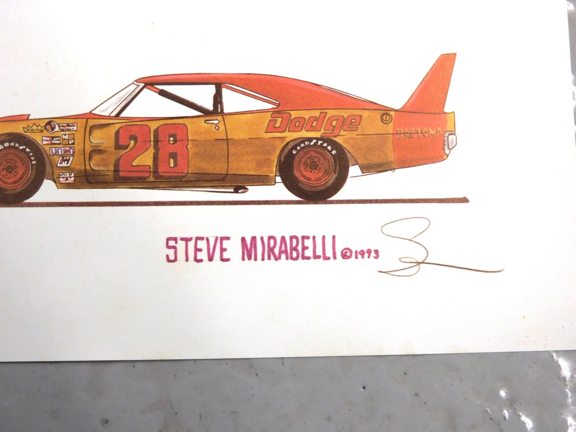 Artwork by Steve Mirabelli is hard to find. This poster is 20"x28" and features the Wing Warriors, or aero-cars, of NASCAR. These cars were designed specifically for NASCAR by Dodge, Plymouth, Ford, and Mercury for the 1969 and 1970 seasons. Steve Mirabelli painted this in 1993. Posters are brand new with no flaws. ALL ITEMS SOLD "AS-IS".
