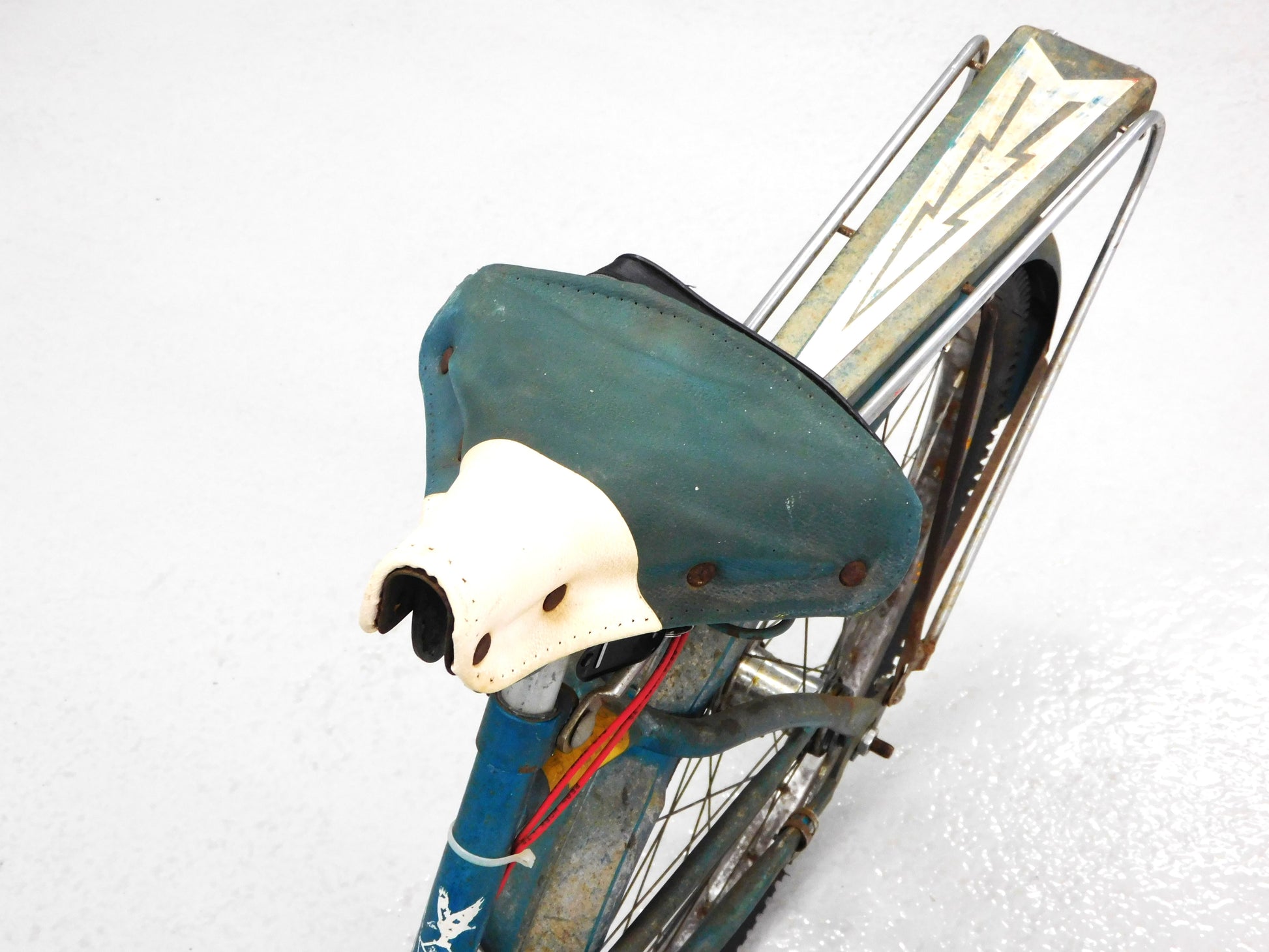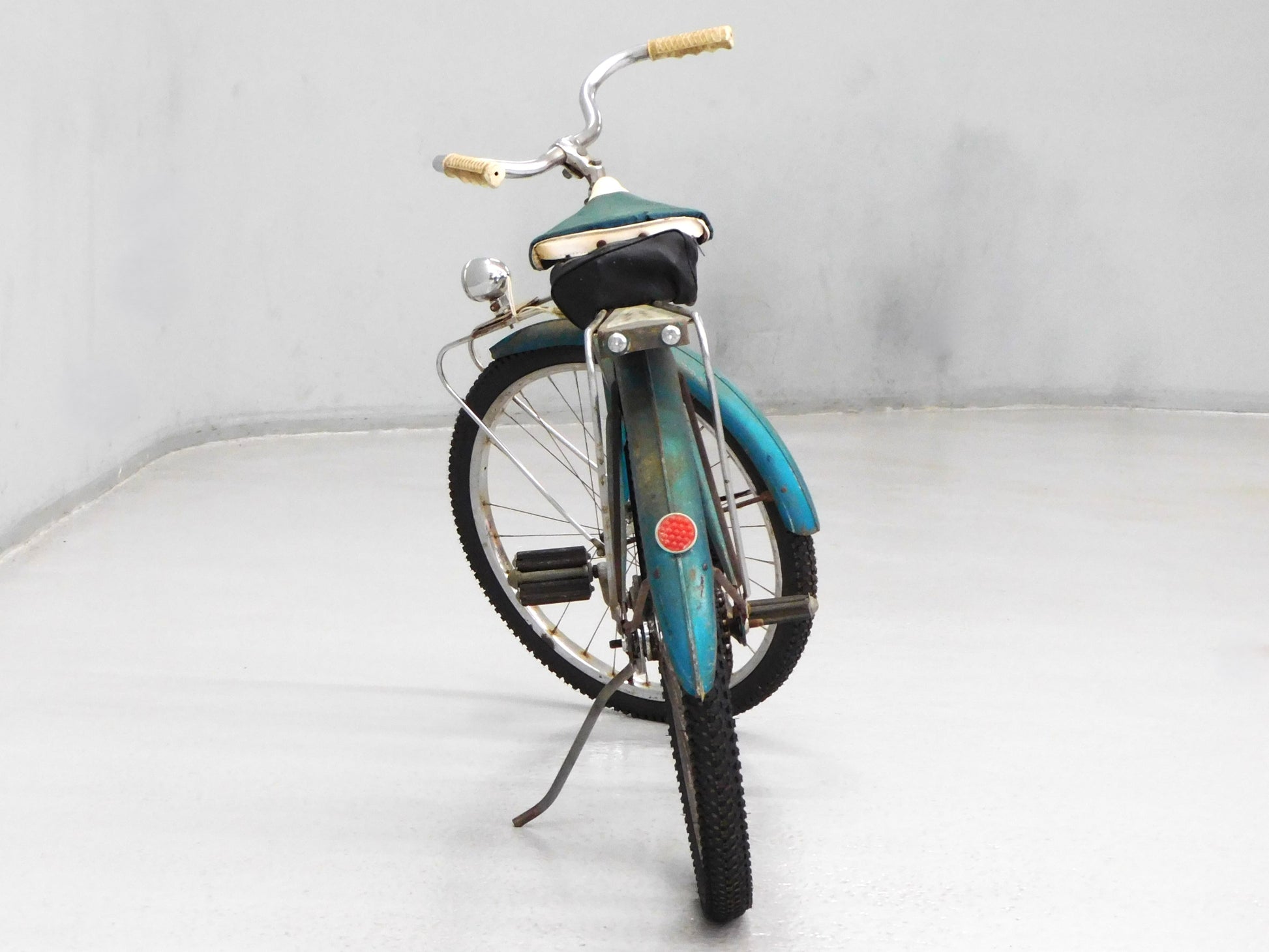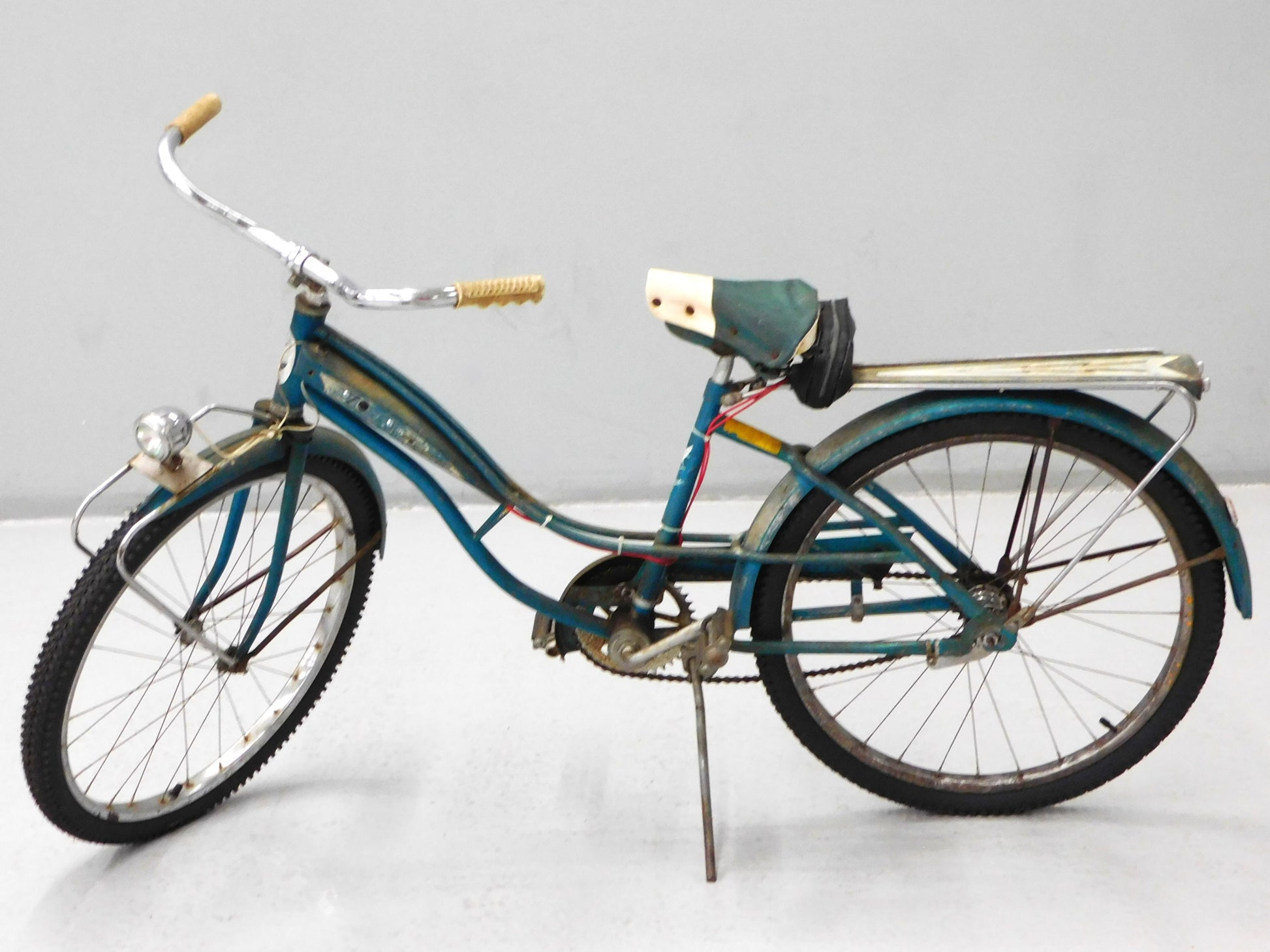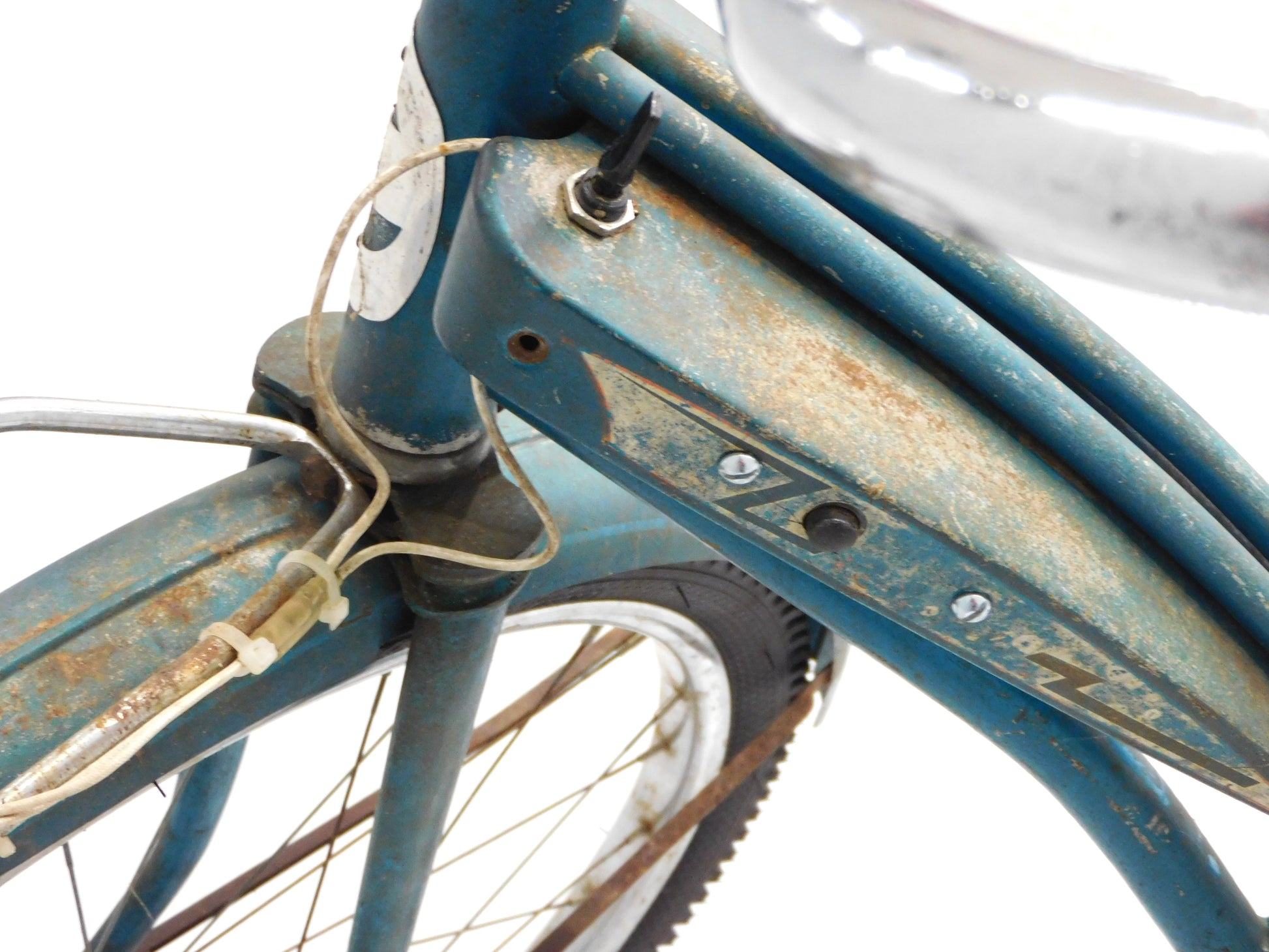 This Teal 1960 Columbia Thunderbolt is all original minus the battery pack for the horn and headlight. The serial number, H148551, is located on the rear drop-out and indicates the bicycle is from 1960. ALL ITEMS SOLD "AS-IS"