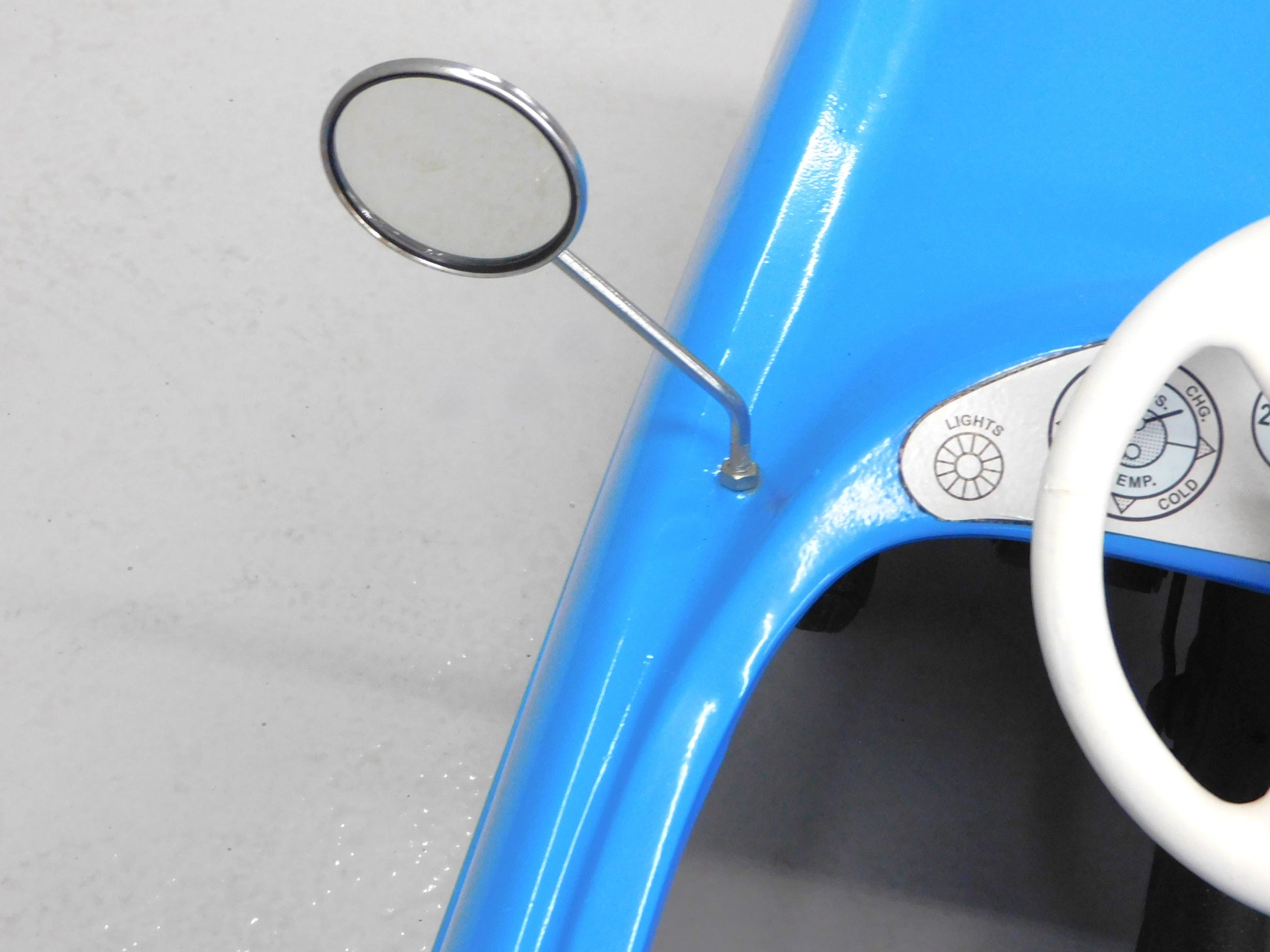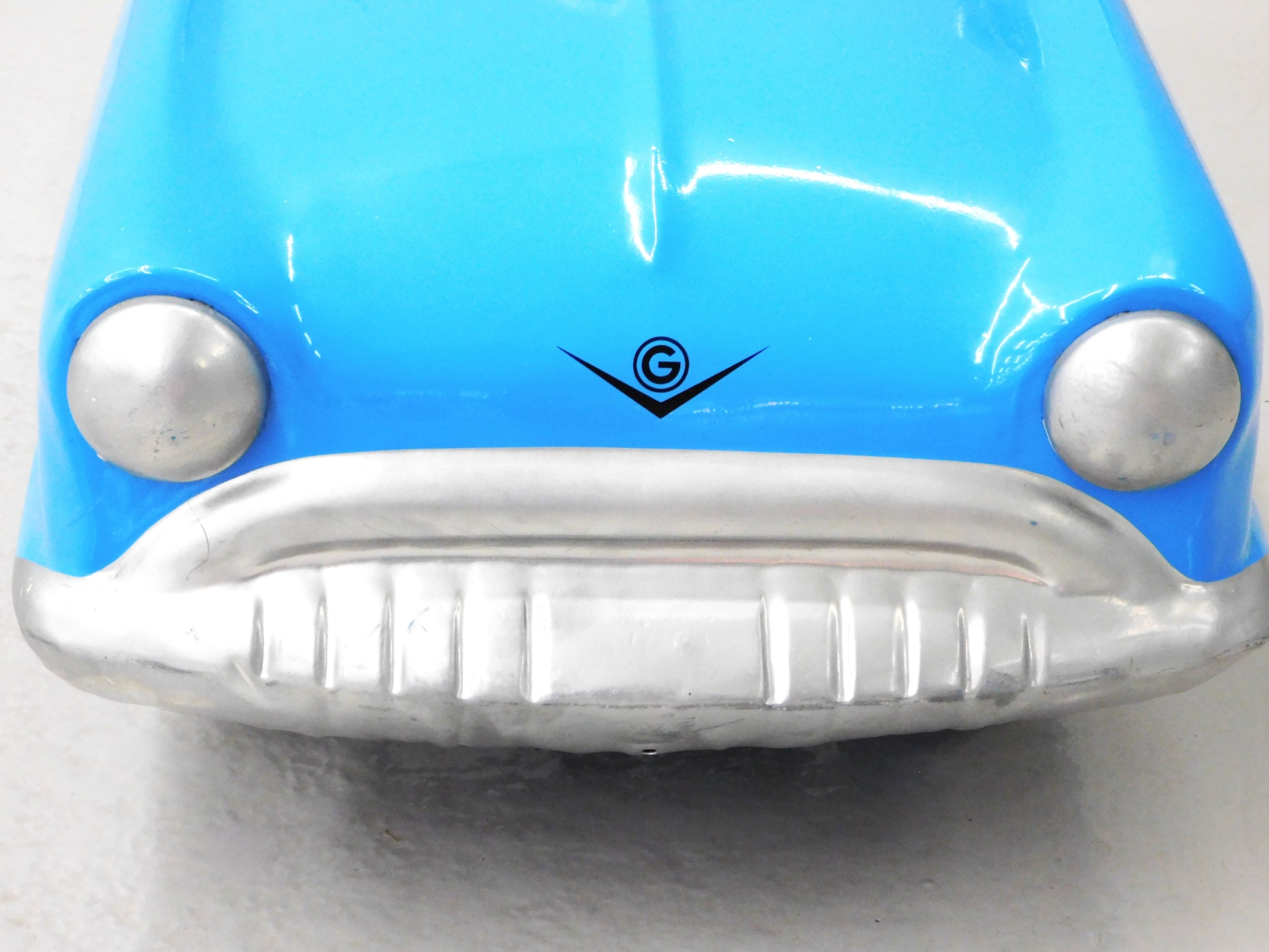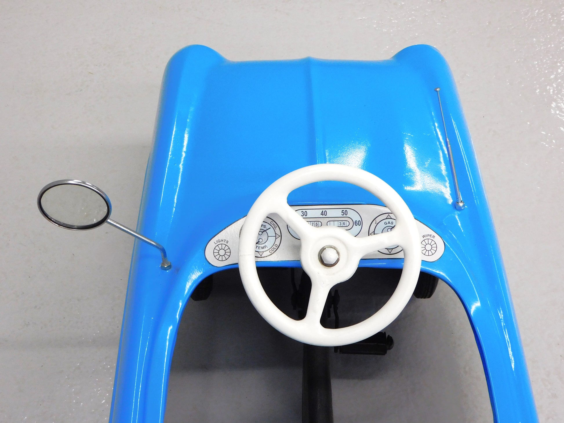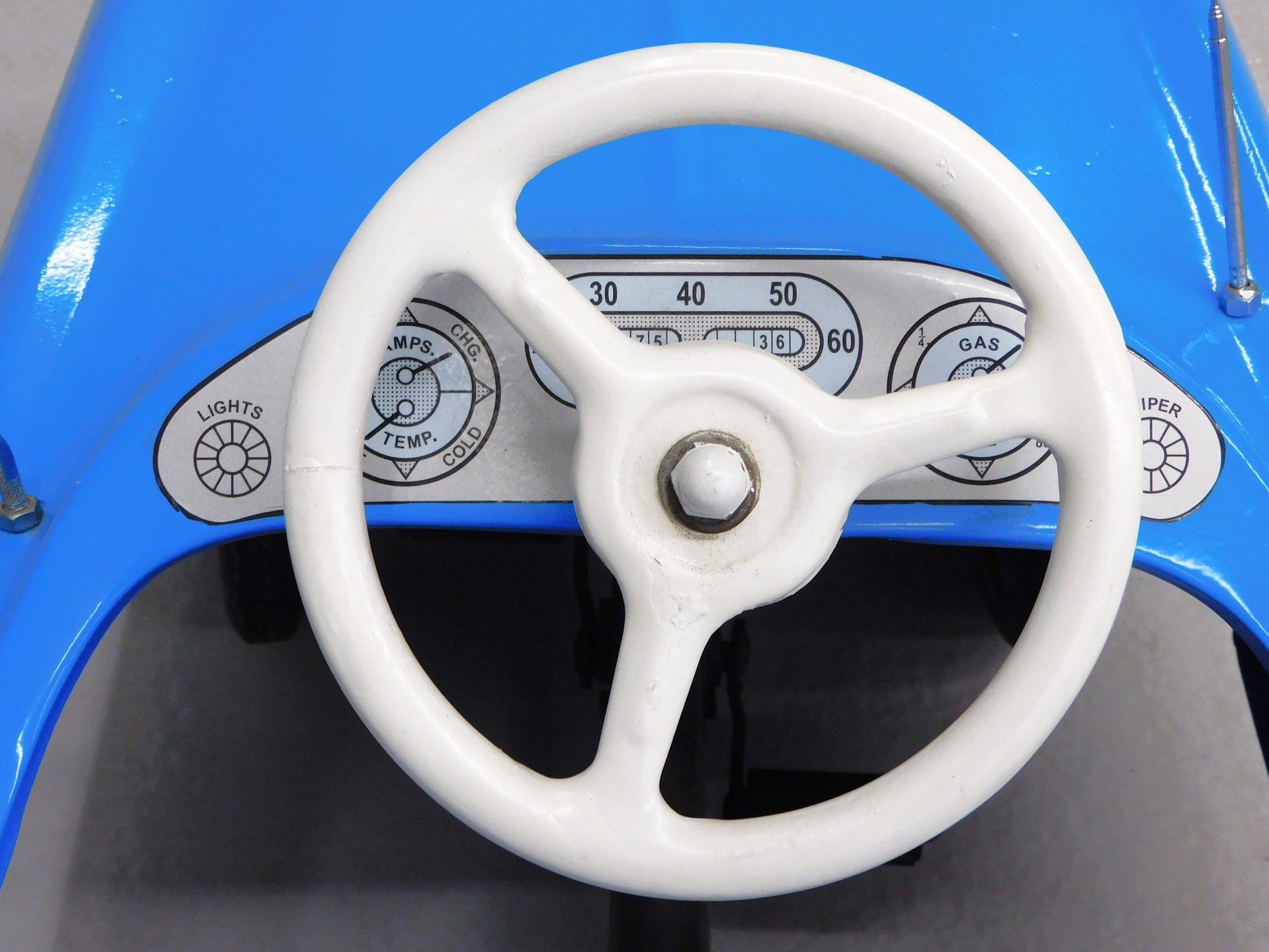 The Garton Toy Company manufactured wheeled toys in Wisconsin between 1879 and 1973. In 1950, the Kidillac was Garton’s most elaborate pedal car, its design based on the 1950 Cadillac. The pedal car features a streamlined, one-piece steel body with no seams or joints that would split apart, and a single-speed chain drive with ball-bearing pedal cranks. The 1953 model featured a rear-view mirror, an aerial, and a removable spare wheel/tire, and was offered in a "new, eye-appealing chartreuse" finish. This one-owner Kidillac was gifted new in 1953 and was originally that new chartreuse color. The original pedal car received a bit of a facelift within the past 3-4 years. It is now powder-coated blue and received a new mirror, antenna, and decals. ALL ITEMS SOLD "AS-IS"