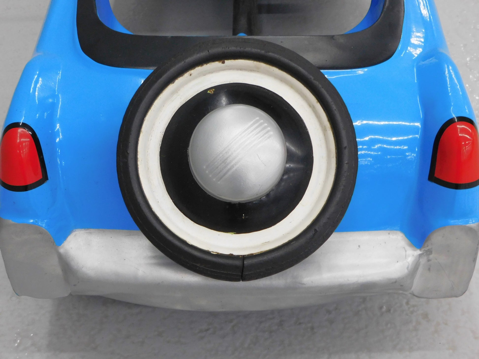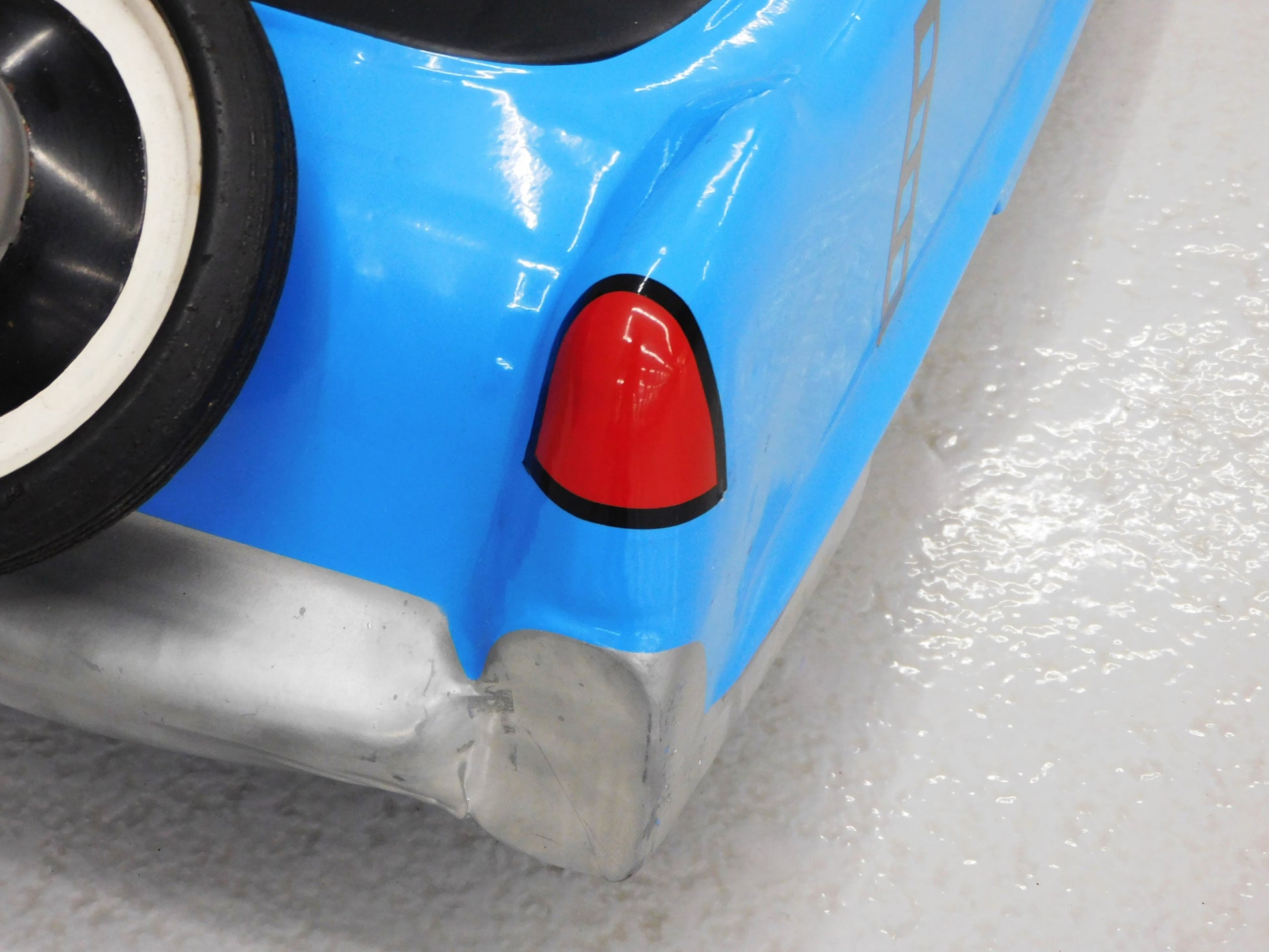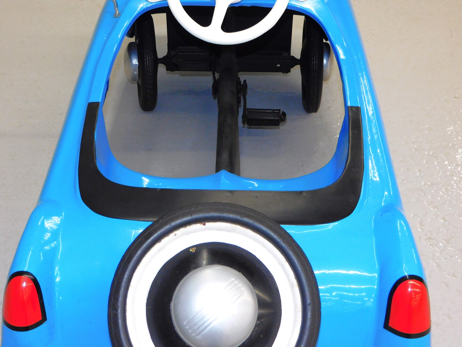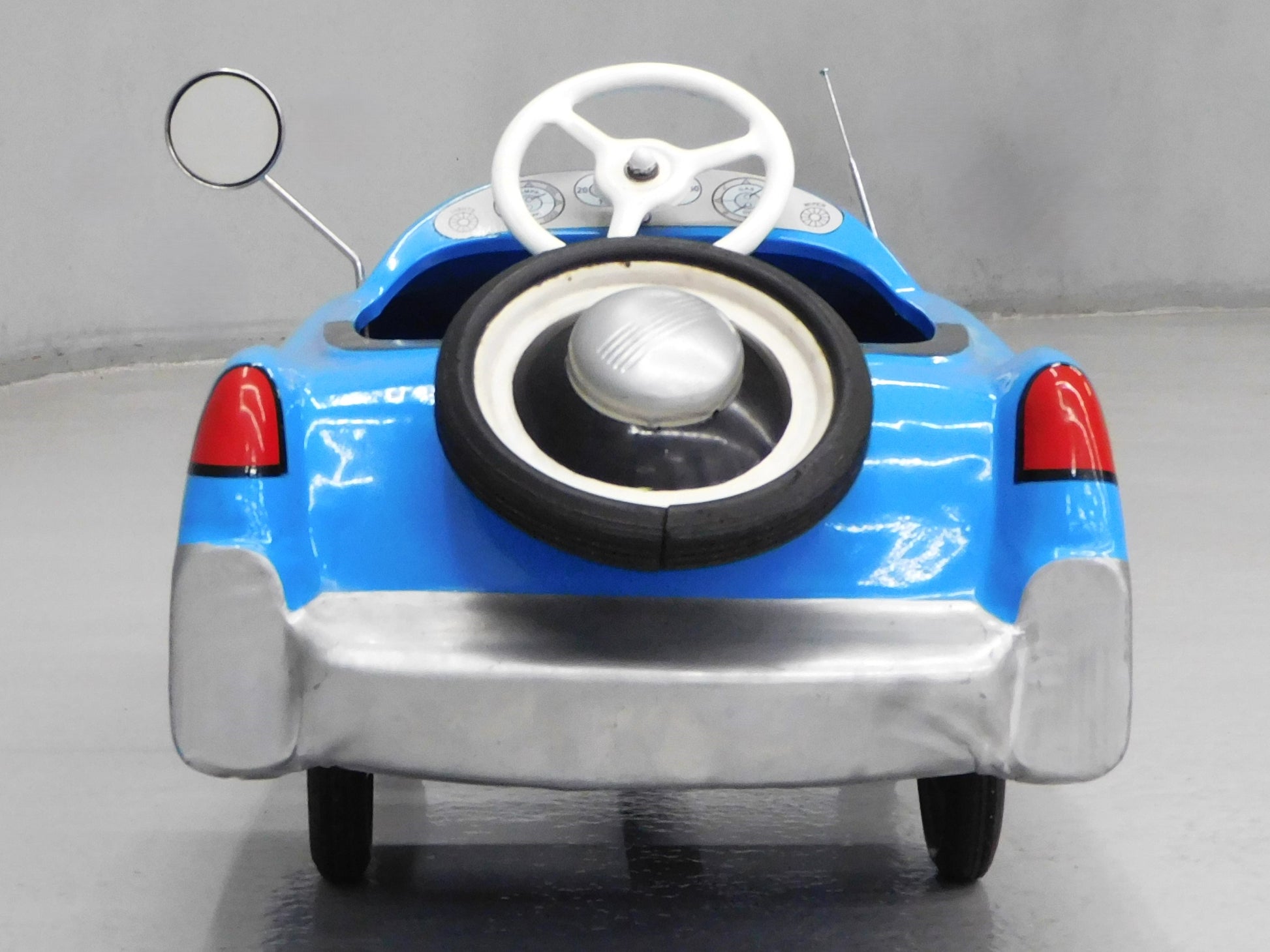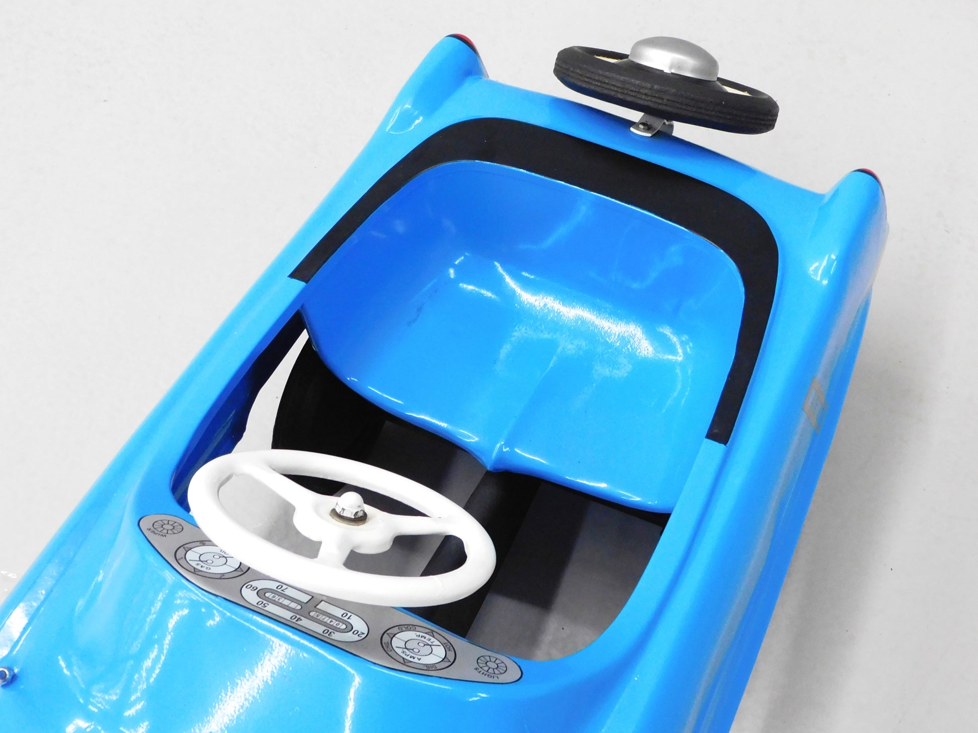 The Garton Toy Company manufactured wheeled toys in Wisconsin between 1879 and 1973. In 1950, the Kidillac was Garton’s most elaborate pedal car, its design based on the 1950 Cadillac. The pedal car features a streamlined, one-piece steel body with no seams or joints that would split apart, and a single-speed chain drive with ball-bearing pedal cranks. The 1953 model featured a rear-view mirror, an aerial, and a removable spare wheel/tire, and was offered in a "new, eye-appealing chartreuse" finish. This one-owner Kidillac was gifted new in 1953 and was originally that new chartreuse color. The original pedal car received a bit of a facelift within the past 3-4 years. It is now powder-coated blue and received a new mirror, antenna, and decals. ALL ITEMS SOLD "AS-IS"