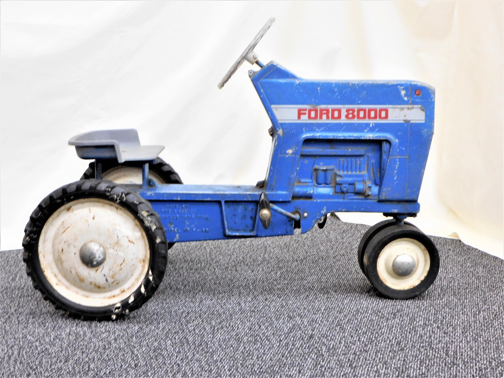 This original, unrestored 1968 Ford 8000 Pedal Tractor is in good condition. It has a gray seat and visible wear. ALL ITEMS SOLD "AS-IS".