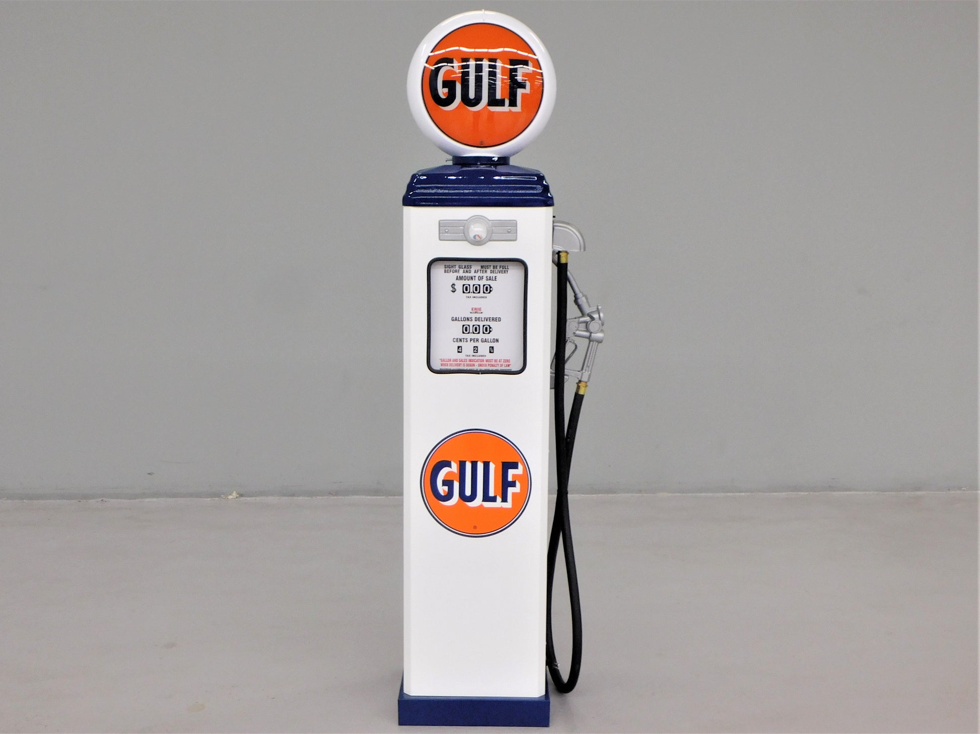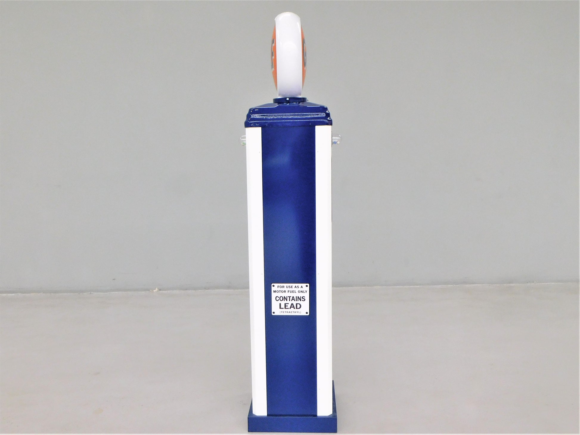 This is a reproduction pump with no inner workings. It has a metal body that is powder coated. The globe is plastic with a glass face. The pump stands approximately 62" tall without the globe and 77" tall with the globe. Counting the pump on the side, it is 24" wide.