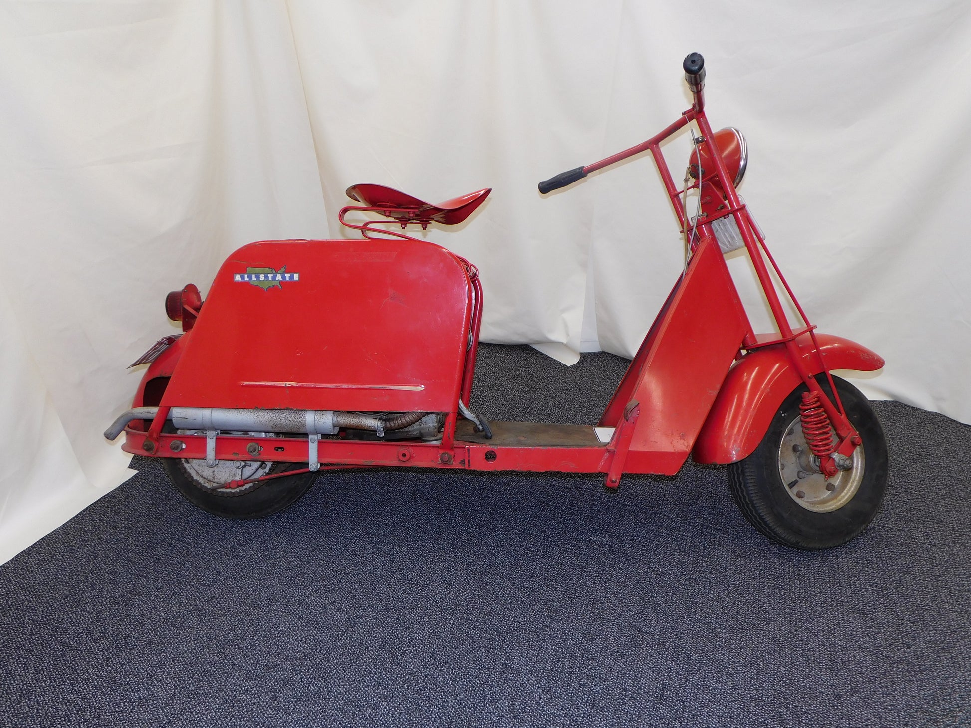 This original, unrestored Allstate scooter comes from the collection of Dennis Carpenter. Cushman, who started making scooters in 1936, supplied scooters for Sears, who marketed all of their scooters as Allstate. This red Allstate is a Cushman production. There is new oil in the 3 HP engine and this scooter runs but does not have a title. Since it is only 3 HP, it is classified as a Moped and can be registered but not titled in NC. Check with your local DMV for their requirements. ALL VEHICLES SOLD "AS-IS".